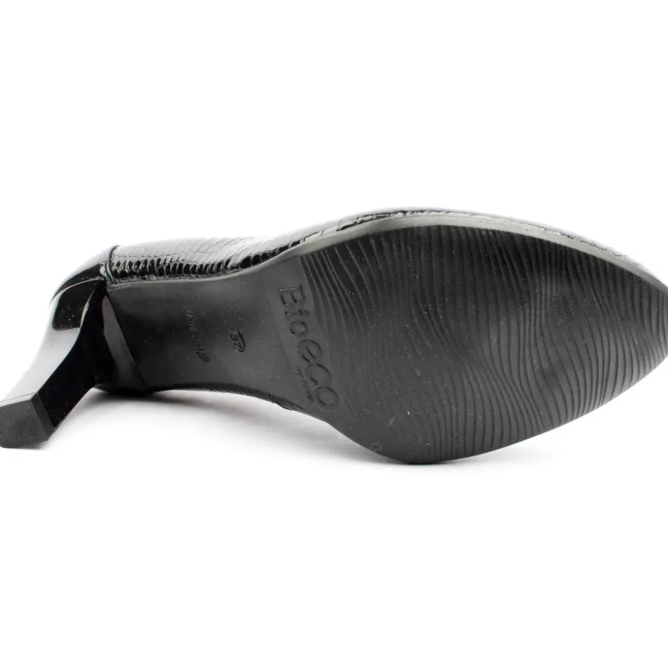 Ladies court shoes from Bioeco by Arka. These shoes are designed using a textured navy patent leather upper with a buckle on the front. It has a breathable cushioned leather insole with a Softstep system.
