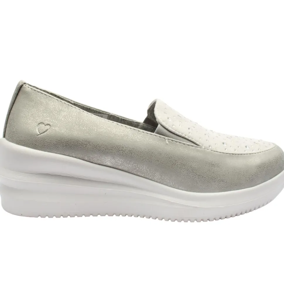 Add a touch of sparkle to your step with the Heavenly Feet Charly in stunning Silver. This eye-catching style features a sleek wedge outsole for subtle lift and a lightweight feel, perfect for day-to-night wear. Silver diamante detailing adds just the right amount of glamour, making Charly the ideal choice for dressing up your casual looks. A removable insole offers customizable comfort, while the lightweight upper keeps things breathable and easy on your feet.