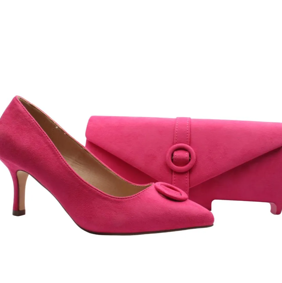 Stylish court shoes from Cocco Ritz Shoes in a stunning fuschia pink faux upper perfect for special occasions & matching outfits. These dressy shoes have a pointy toe which elongates the leg. The low heel and padded leather insole makes them a great choice for extended wear.