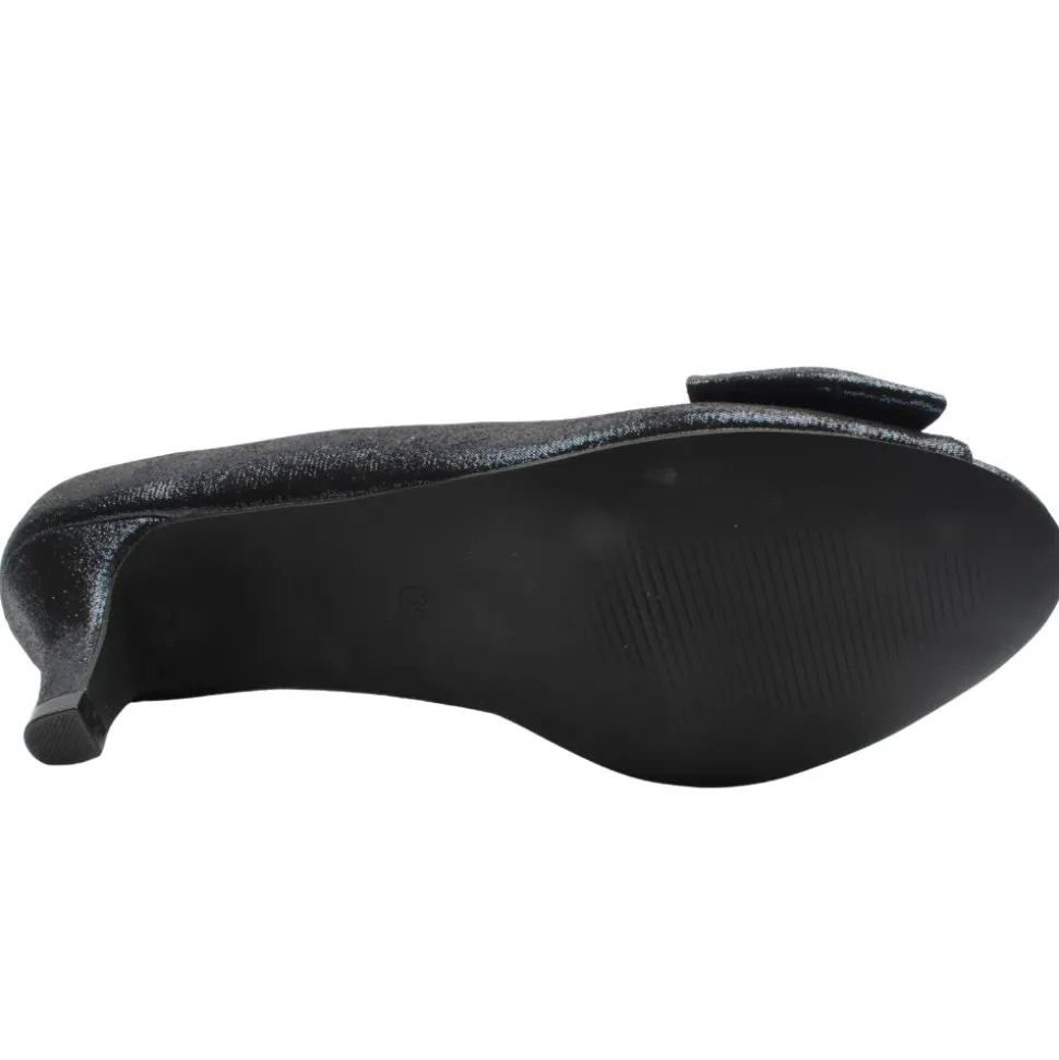 Women’s low heels from Coco Ritz shoes. These dressy shoes have a navy shimmer upper. The beautiful design across the toe is an elegant and stylish choice for any outfit. Featuring the leather insole which allows all day long comfort.