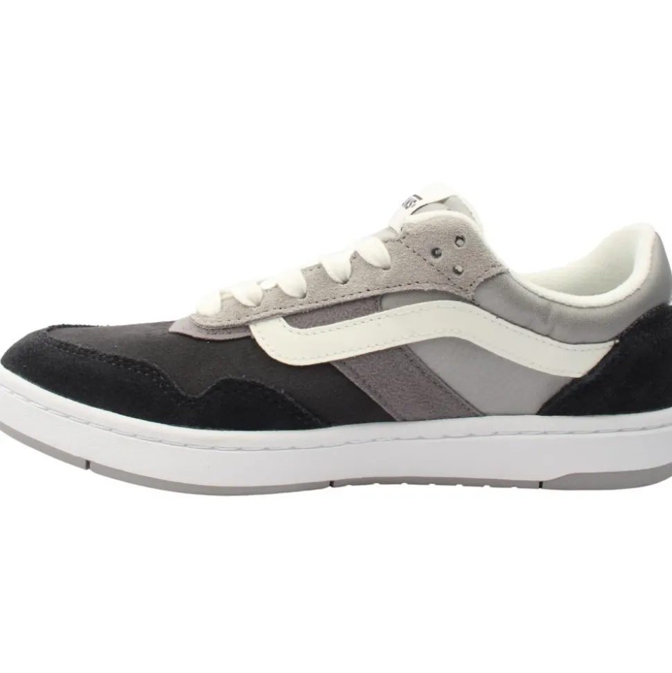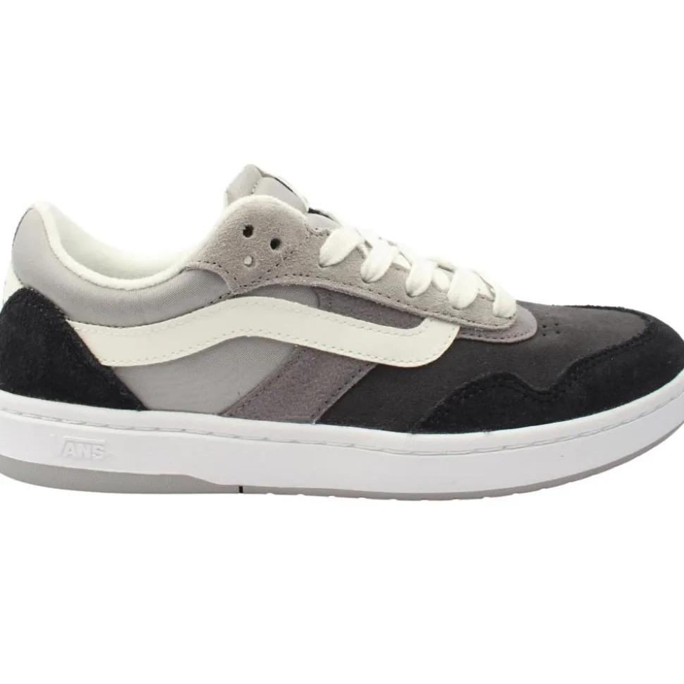 Men’s shoes from Vans shoes. This Vans shoe has a black/grey suede upper with Vans detailing at the side. A lace closure keeps the shoe secure on the foot. The padded collar allows a comfortable fit for all day wear.