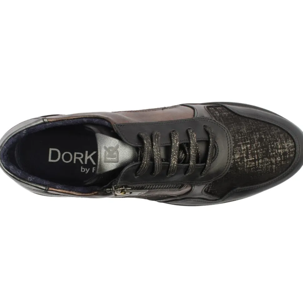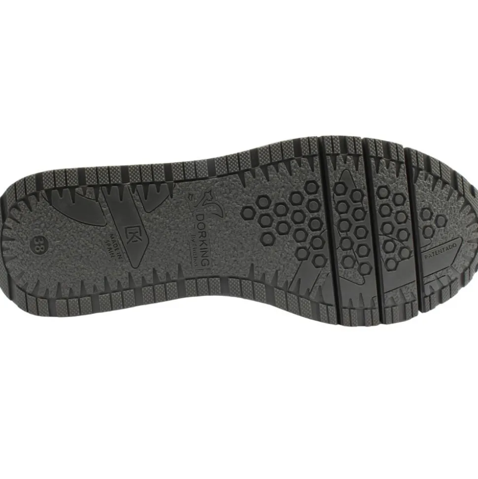 Ladies shoes from Dorking by Fluchos. The soft leather upper showcases a striking combination of gold, grey, and black, adding a touch of elegance to your everyday look. Featuring both lace and zip closure, these shoes provide an adjustable and secure fit. The slight wedge heel offers subtle height, while the patent heel cap adds a sleek finish.