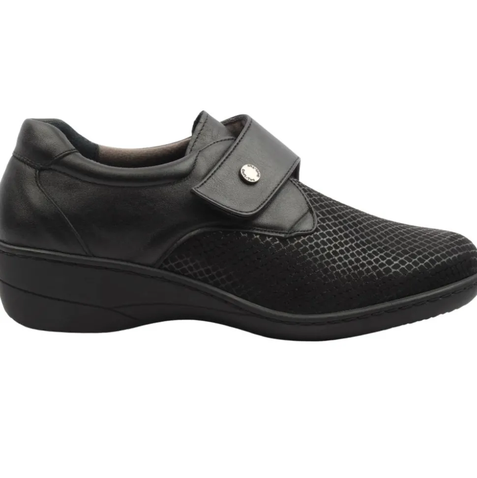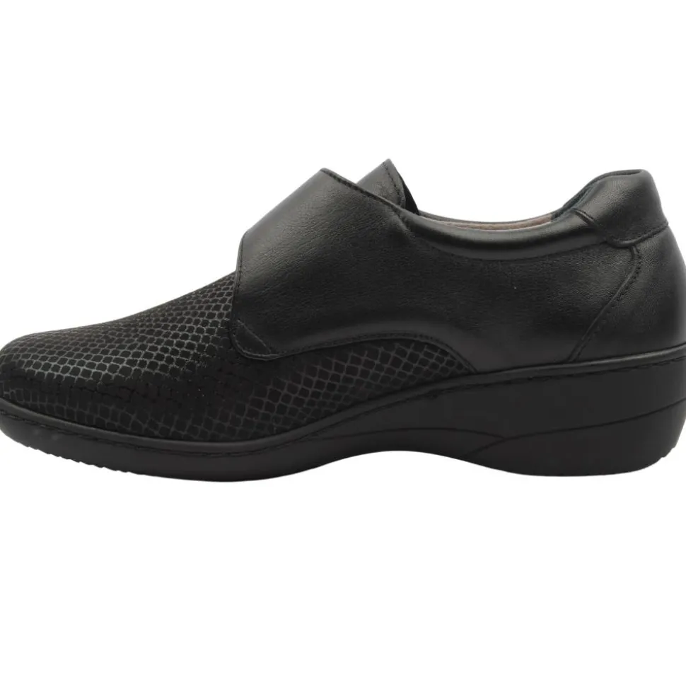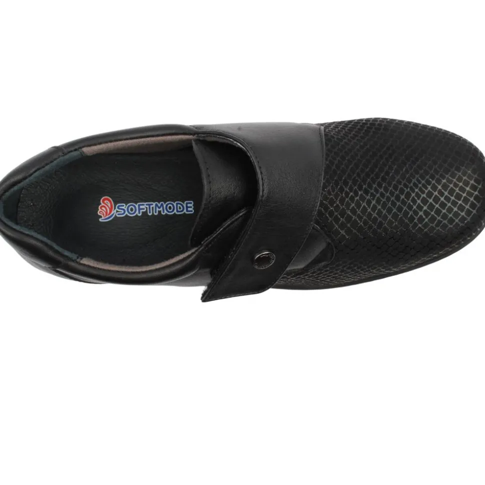 These ladies Softmode shoes are designed with a wide fit, ensuring your feet have the space they need to feel comfortable all day long.The Softmode Eleanor shoes feature a Double E width fit and a removable insole,providing extra room for those who need it. The upper is a soft stretchy black material and the velcro strap allows these shoes to open up wide to allow for easy on/off.This style has a soft-tex membrane making it water repellent..