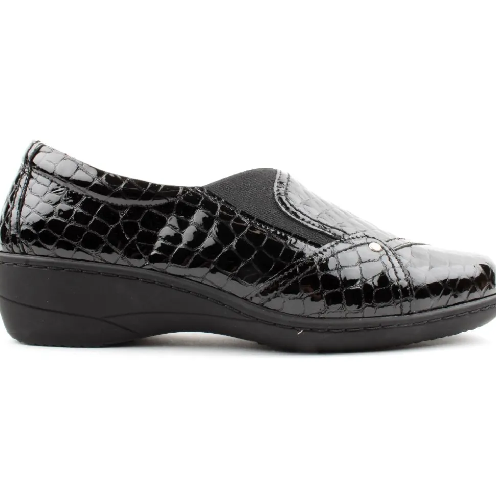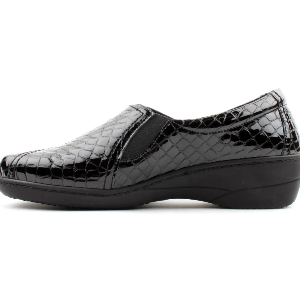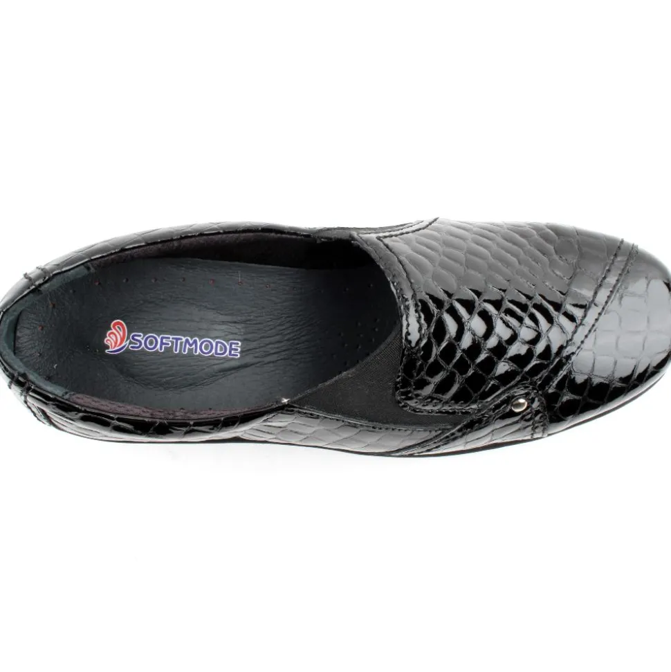 Wide fitting slip on ladies shoes with a small wedge heel from the Softmode range. This wedge shoe is perfect for everday wear with jeans or trousers. It has elastic at the side for easy on & off. It is a 2E wide fitting style and has a removable insole for those who have inserts or need extra width