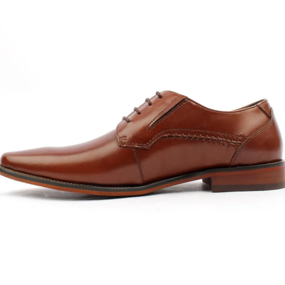 Dressy Mens shoe from Escape. Thess Mens shoes have a tan leather upper with a fine stitch detailing. This shoe has a lace closure with an elasticated gusset which allows for easy on/off. A padded memory foam insole adds to the comfort of this style.
