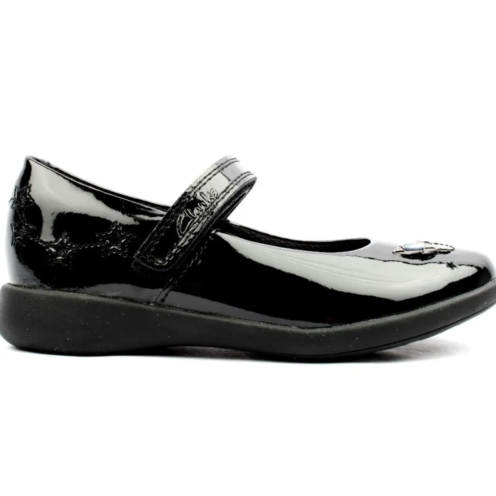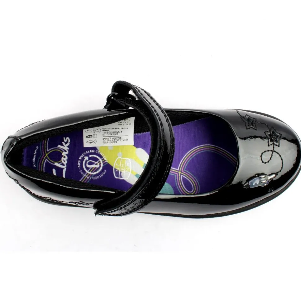 Girls School Shoes from Clarks. These Girls Mary Jane Shoes have a soft black patent leather upper, with antibacterial insole made from 50% recylced content. Get closer to outerspace with tiny engraved stars and space ship feature. Top Bumper for protection against scratches and scuffs. Padded collar for long lasting comfort.