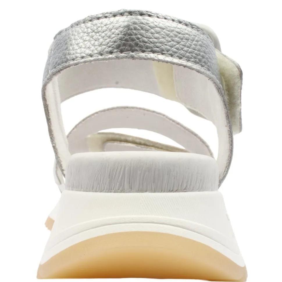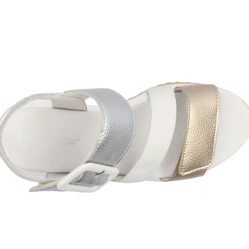 Women’s sandals from our Rieker Revolution collection. Featuring a three-strap design in gold, white, and silver, this sandal offers a fresh, modern look that pairs perfectly with any summer outfit. The adjustable Velcro straps ensure a customized fit, with an ankle strap featuring a buckle detail for added elegance.
