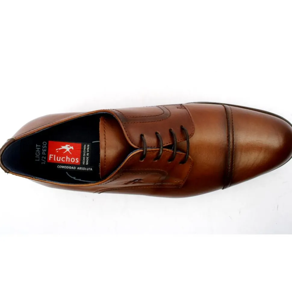Stylish mens dress shoes from the Spanish brand Fluchos Shoes.These ligtweight shoes have a rich tan leather upper with a toe cap design. The lace closure ensures a secure fit. Additionally, the cushioned insole is removable for those who need to insert an orthotic..