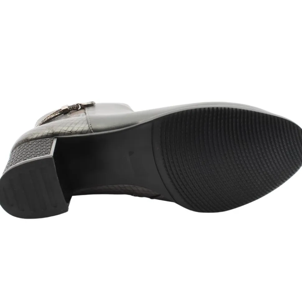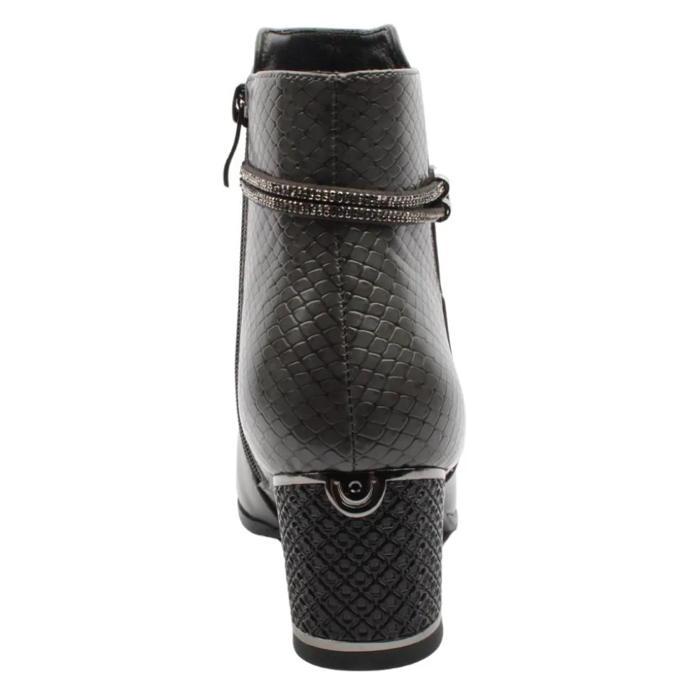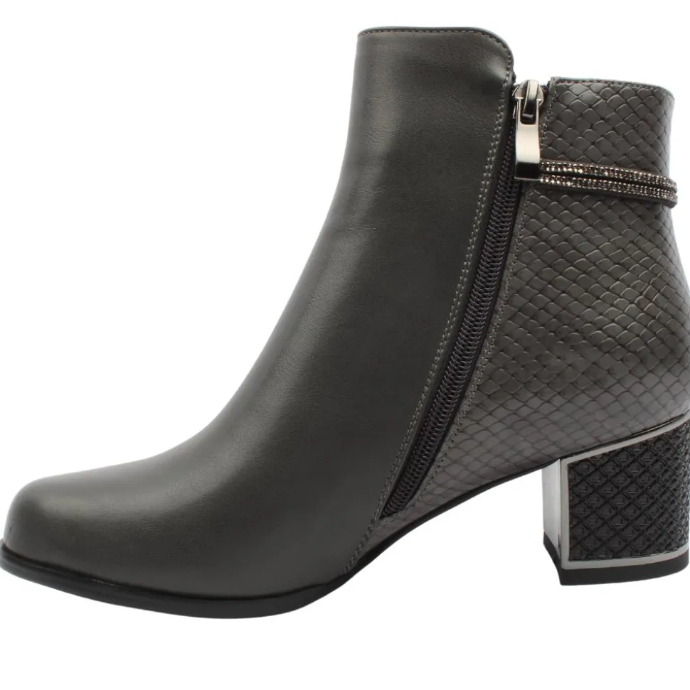 Stylish ladies ankle boots from Redz Shoes.These low heeled boots have a grey upper with a repltile print back panel and a textured block heel. The chain detail adds to the dressy look of this style of these Redz boots.The low block heel adds stability.