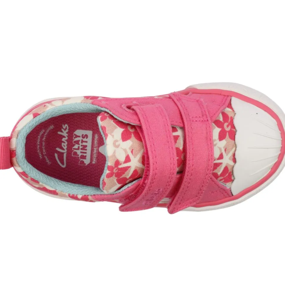 Girls canvas shoes from Clarks Shoes. This style is set on a lightweight, grippy sole & features a bouncy foam footbed and padded collar to keep little feet comfortable and supported. Designed with a floral and beach affect across the sole and upper. The rubber heel tab adds extra protection and enhanced durability. The Velcro straps offer easy of on/off and a secure fit on the foot.