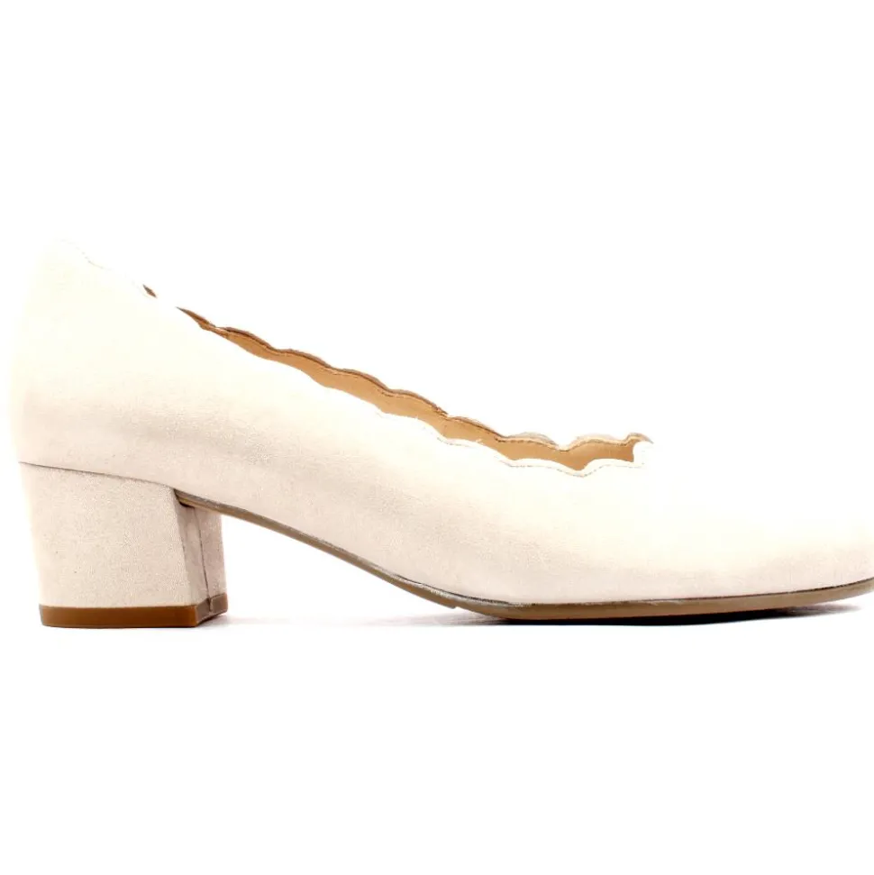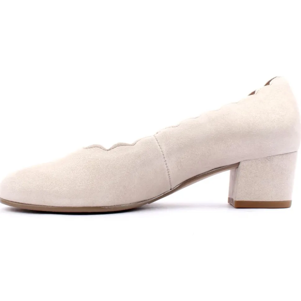 Low heel dressy court shoes from Gabor Shoes. This wide fitting court shoe has a scalloped edging with rounded toe and block heel. The cushioned leather insole adds to the comfort of this style.