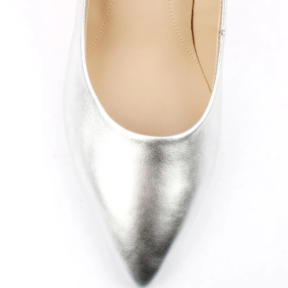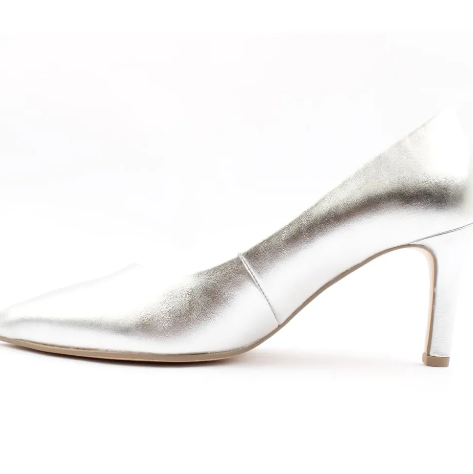 Ladies court shoes from Gabor shoes. These dressy shoes have a lovely silver metallic upper with a pointed toe & stiletto heel. The court shoe has a leather insole adding the the comfort of the shoe.