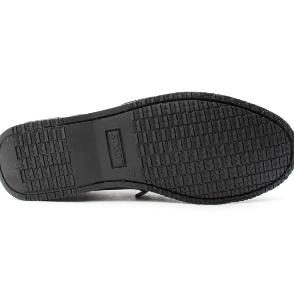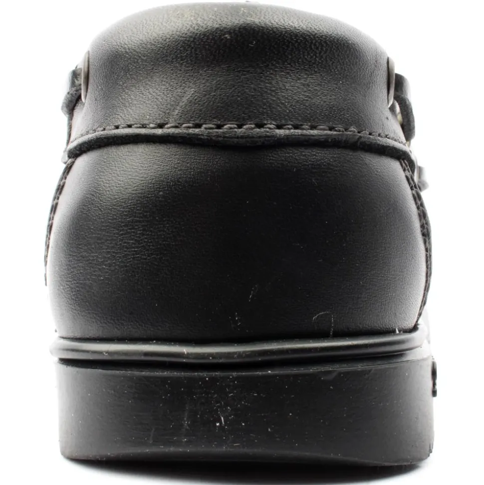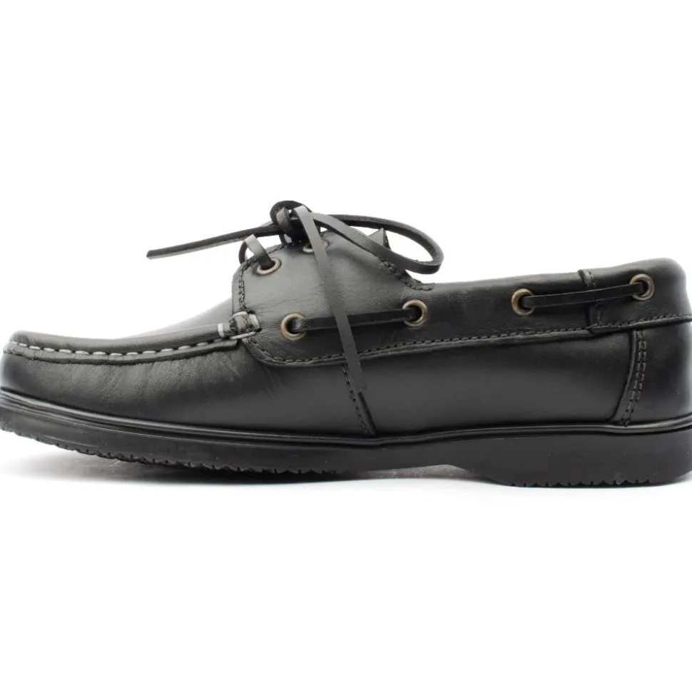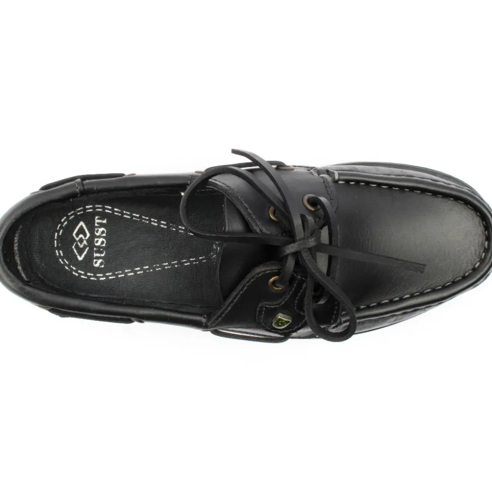 Susst Deck Shoe in Black Leather Upper with black sole. It is available from a size 36 (Uk Size 3) to a size 42 (Uk Size 42) This shoe works as an everyday casual shoe or is very popular for school wear.