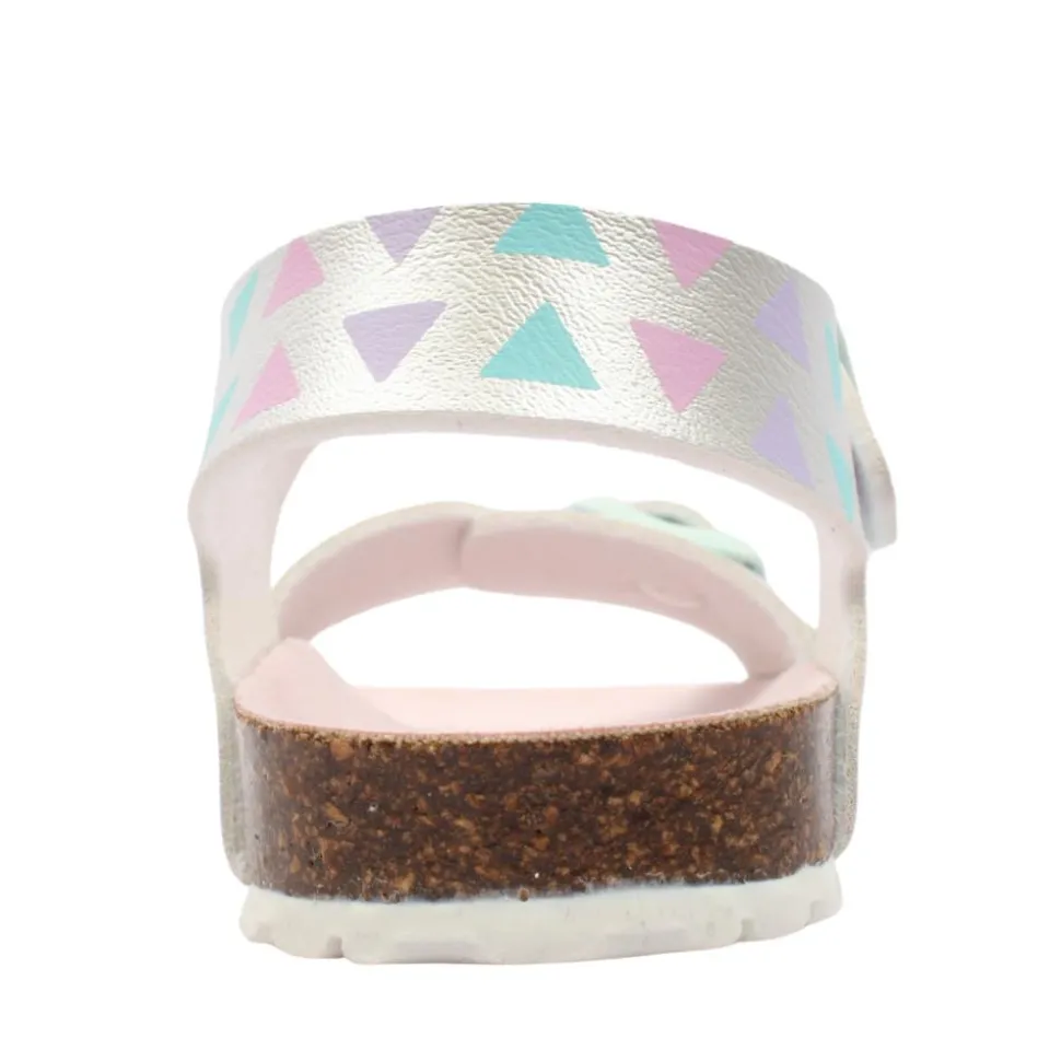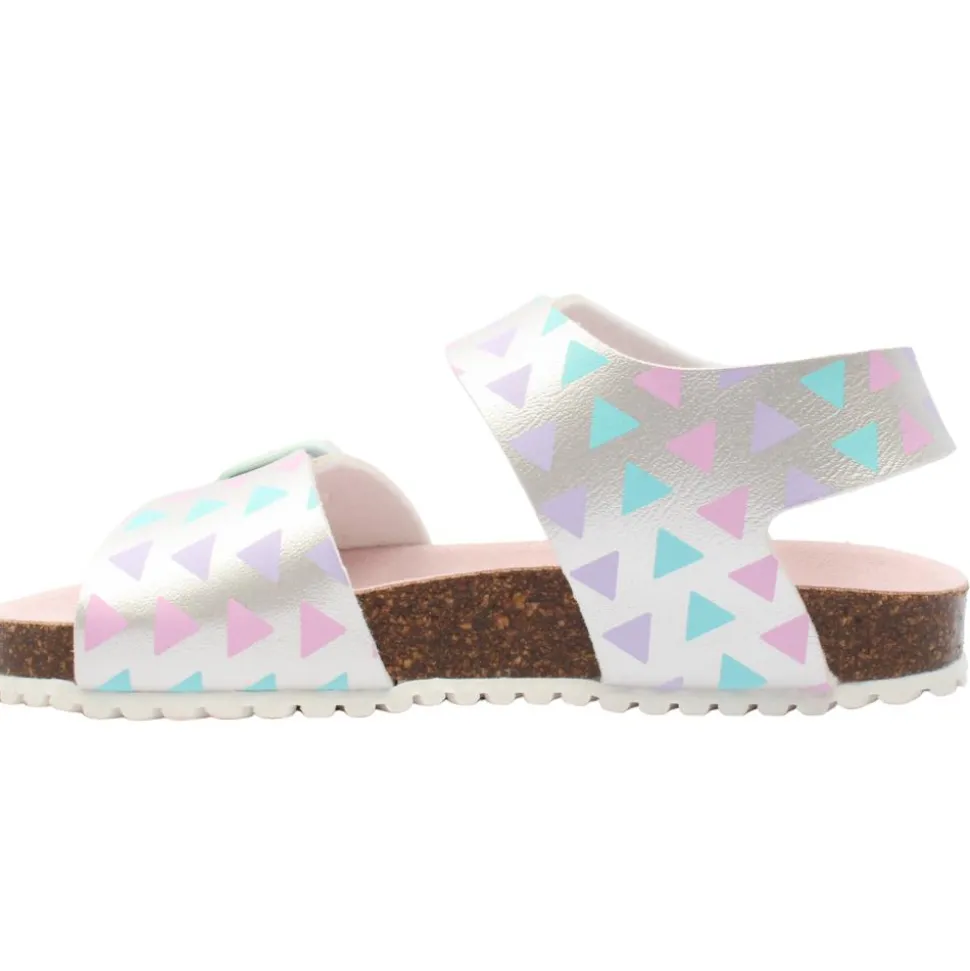 Adorable Girls sandal from Garvalin. Featuring a white upper adorned with a charming pattern of turquoise, pink, and purple triangles along the upper. Equipped with a convenient double buckle strap for easy on/off. This stylish sandal is perfect for the summer season.