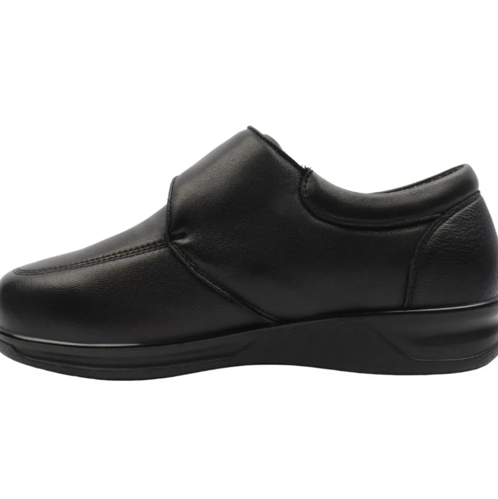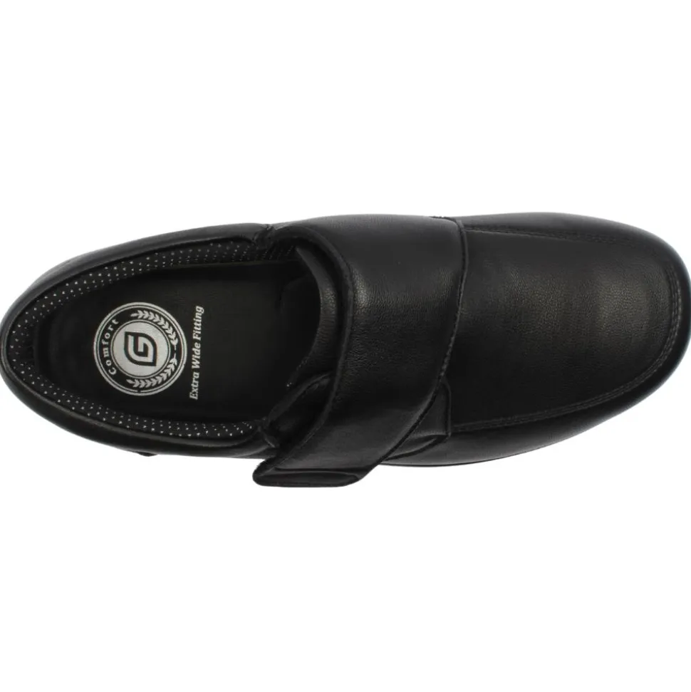 Extra wide fitting mens shoes from G Comfort shoes. These shoes have a single Velcro strap closure & a fold down tongue which allows for easy on & off. Designed with a removable leather insole for those who need orthotics.