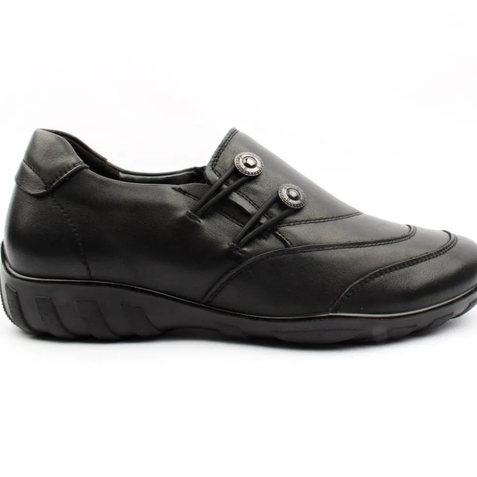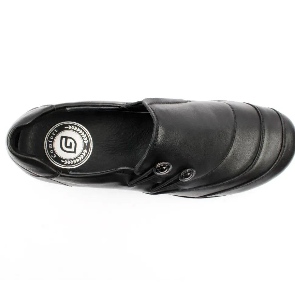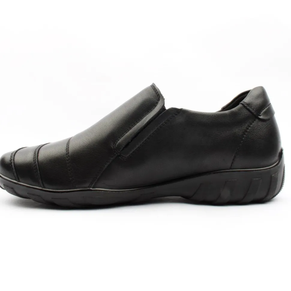 Wide fitting ladies shoe from the “G Comfort” collection. This shoe has a soft black leather upper with a fine stitch detail. This slip on shoe has a double elasticated gussett which allows for easy on/off while ensuring a secure fit. The shoe has a removable cushioned insole. A great style for everyday wear!