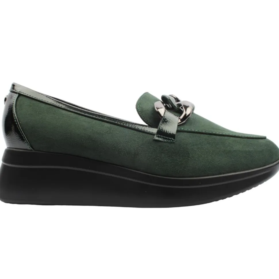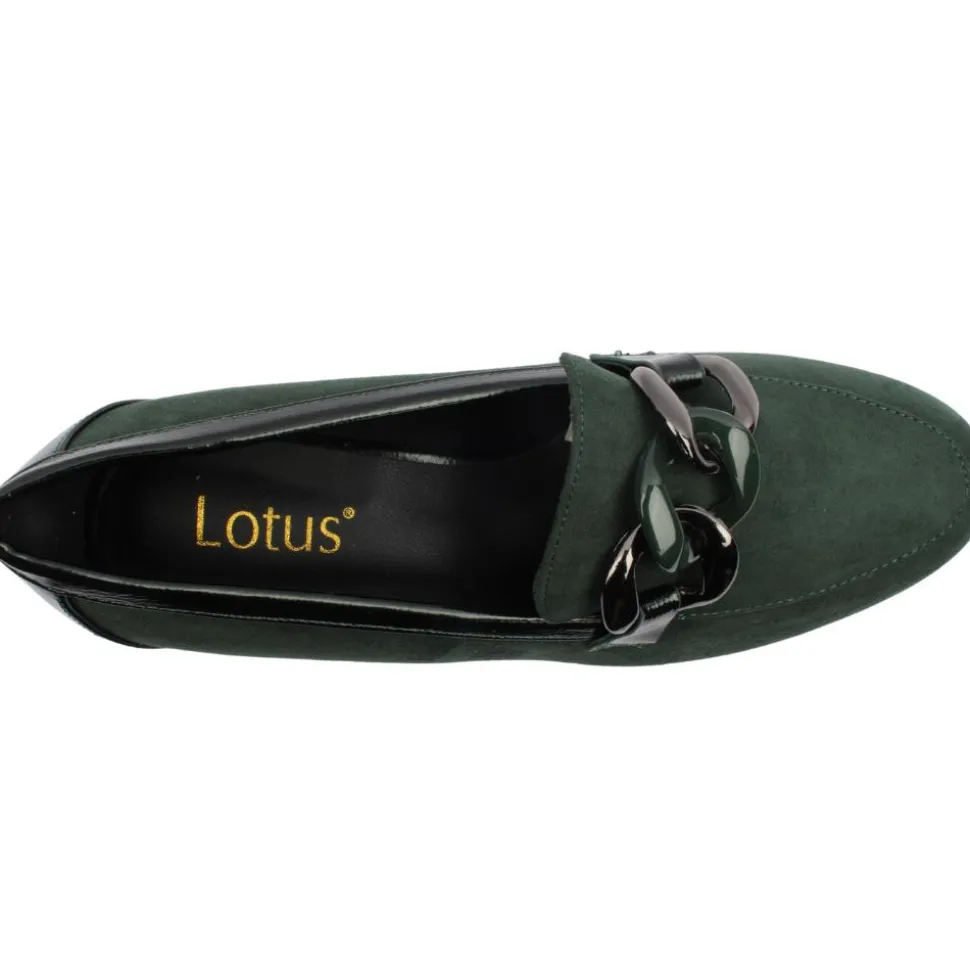 Womens loafers from Lotus shoes. These loafers have a green faux suede upper and a chain detailing. This loafer sits upon a platform sole. The perfect shoe for everyday and work.