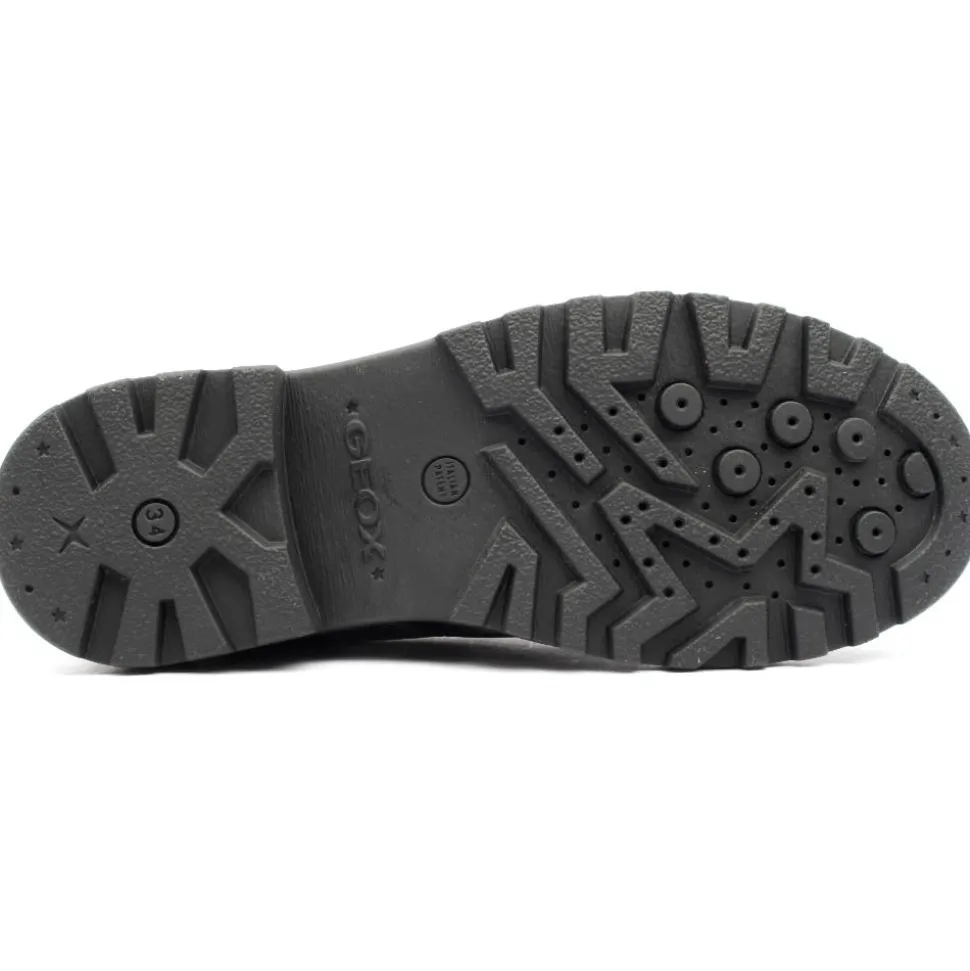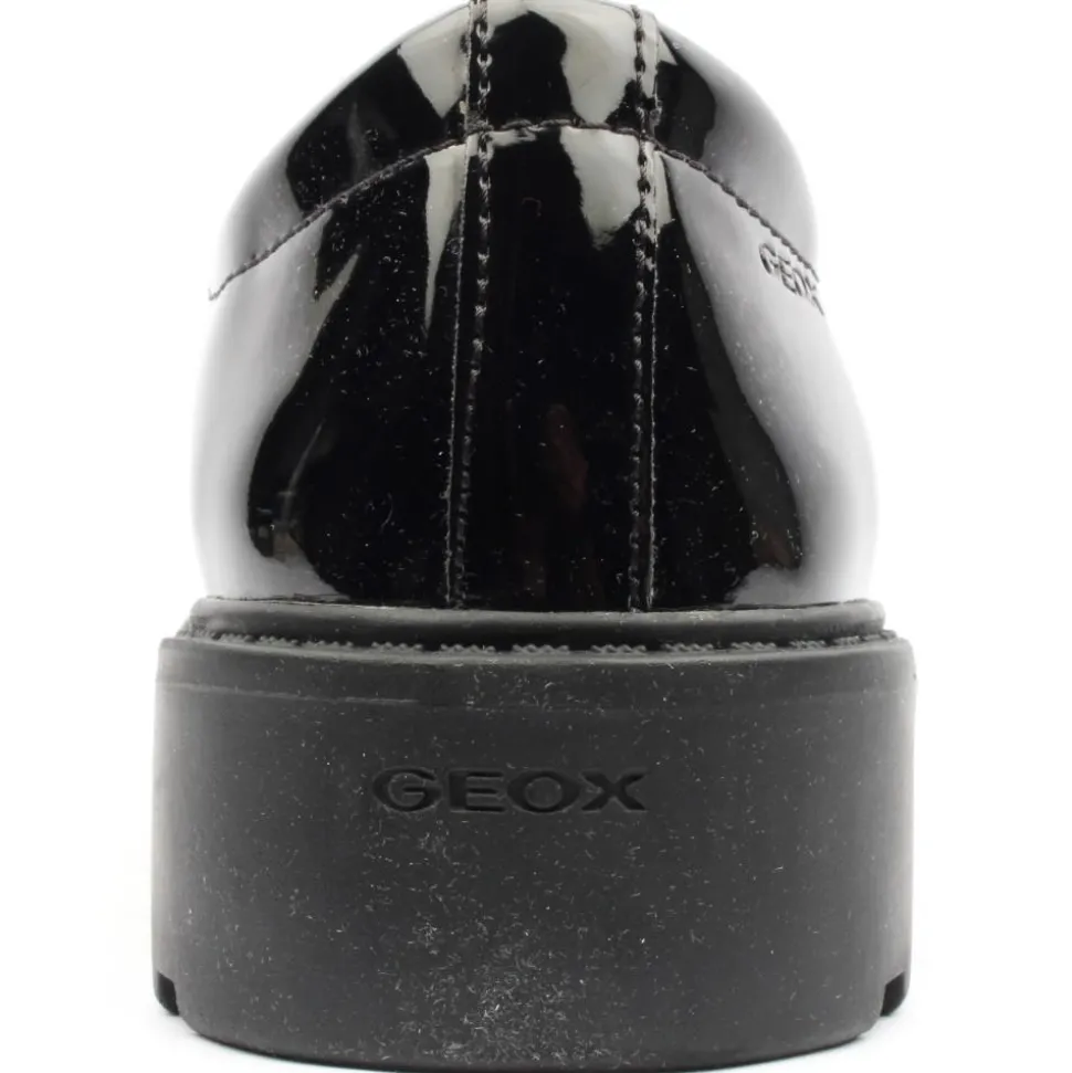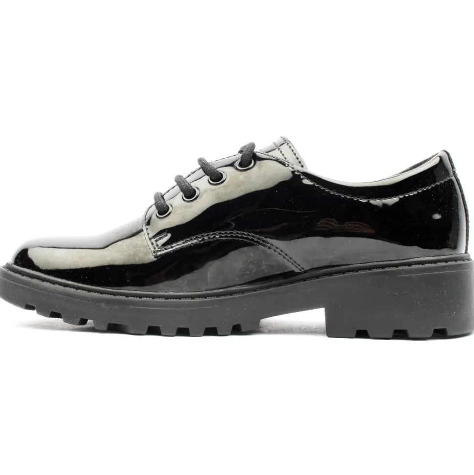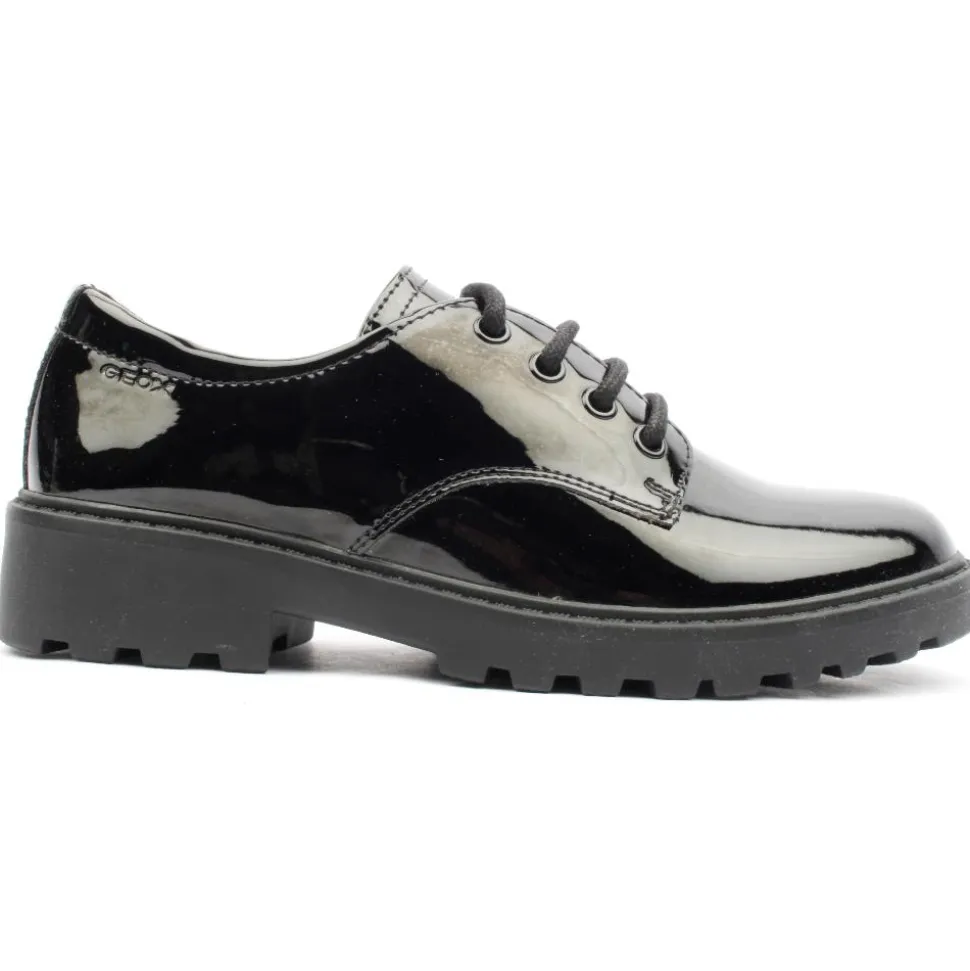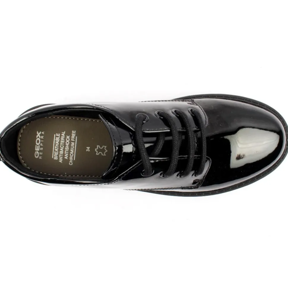 Girls back to school shoes from Geox. This shoe has a soft black patent upper with a lace closure. This lightweight shoe has a breathable,antibacterial, antishock, chromium free, leather insole help keep feet fresh for all day wear.