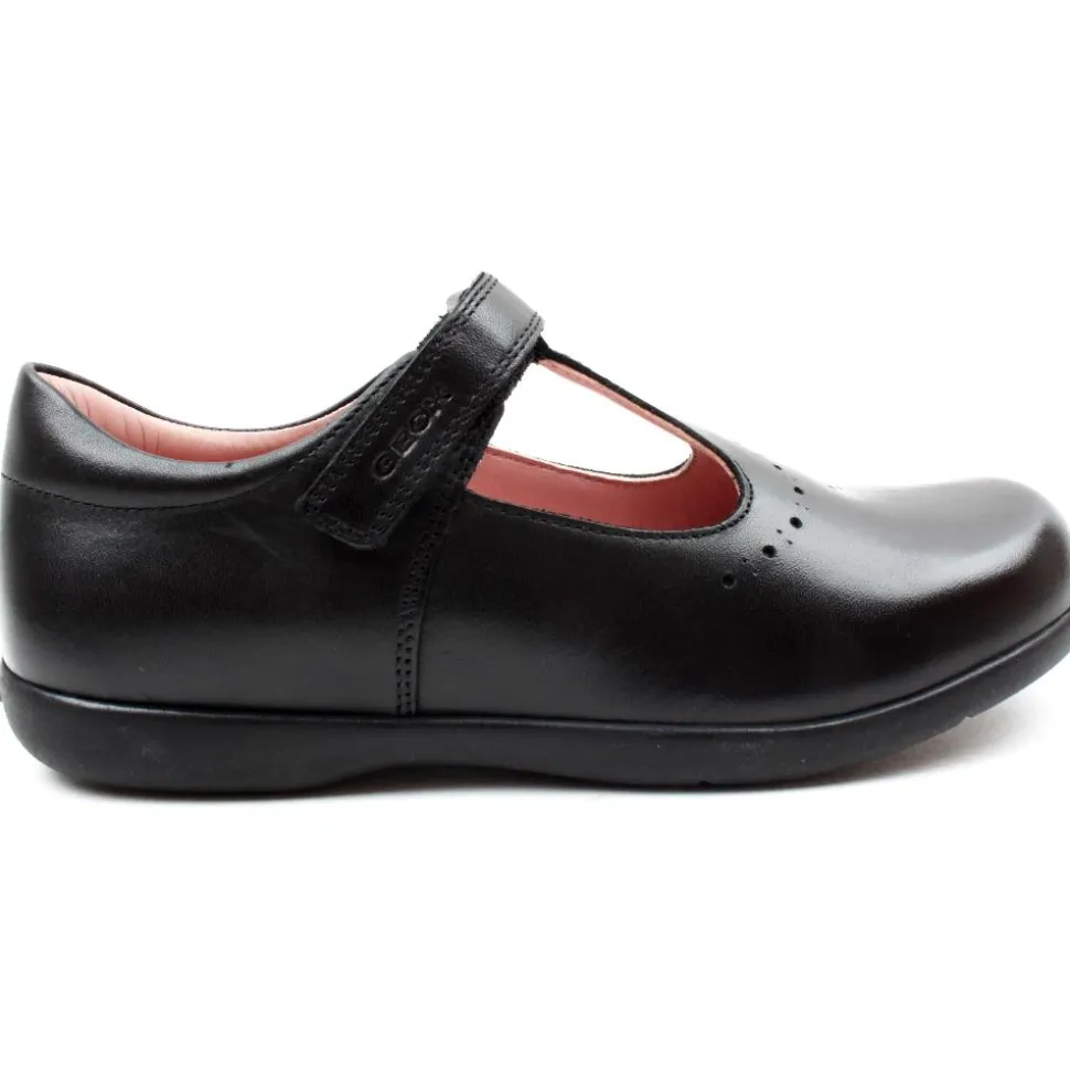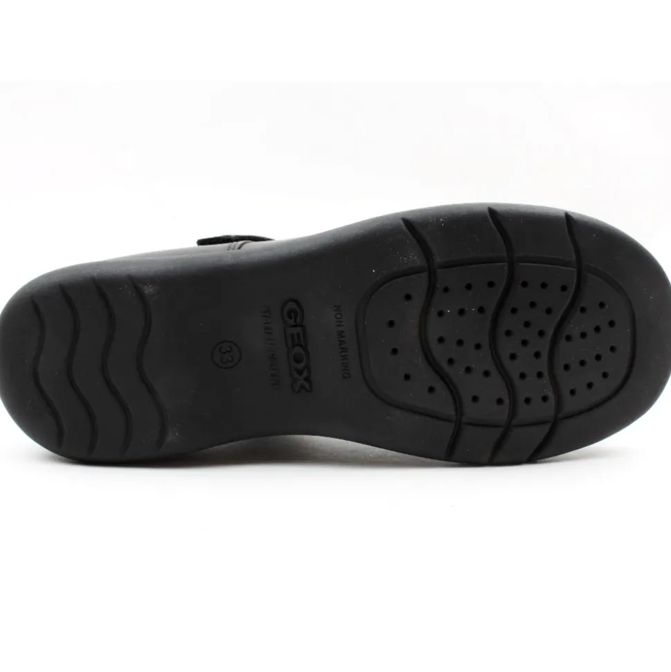 Back to school shoes by Geox. This girls school shoe is a soft black patent upper. A t-bar velcro strap allows for easy on/off whilst keeping the foot secure. A breathable,antibacterial, antishock, chromium free, leather insole help keep feet fresh for all day wear.