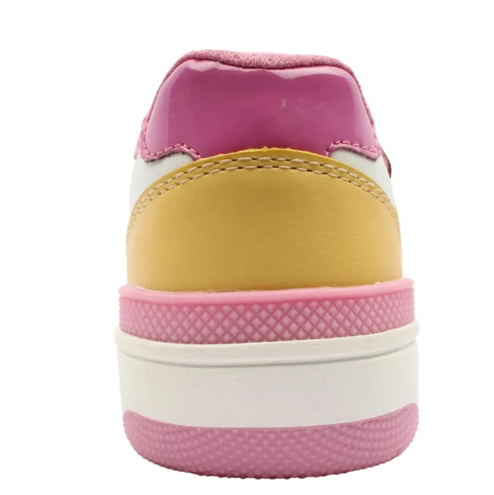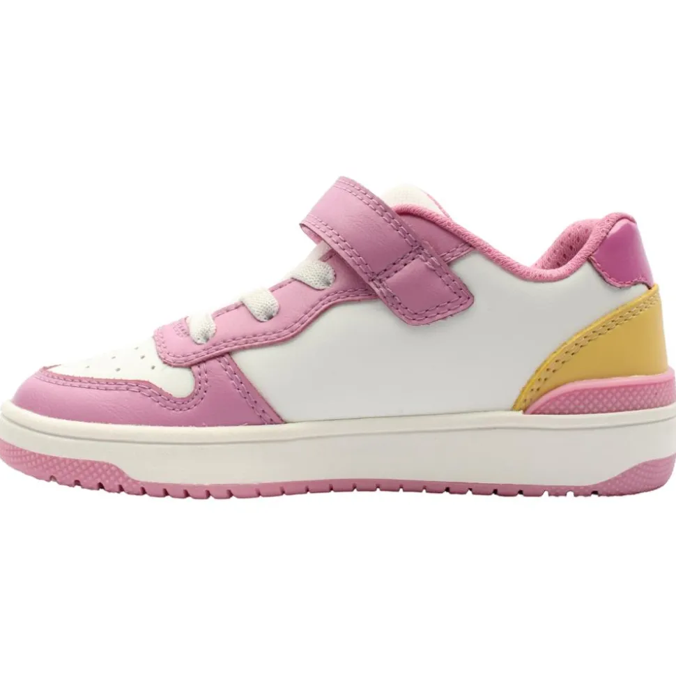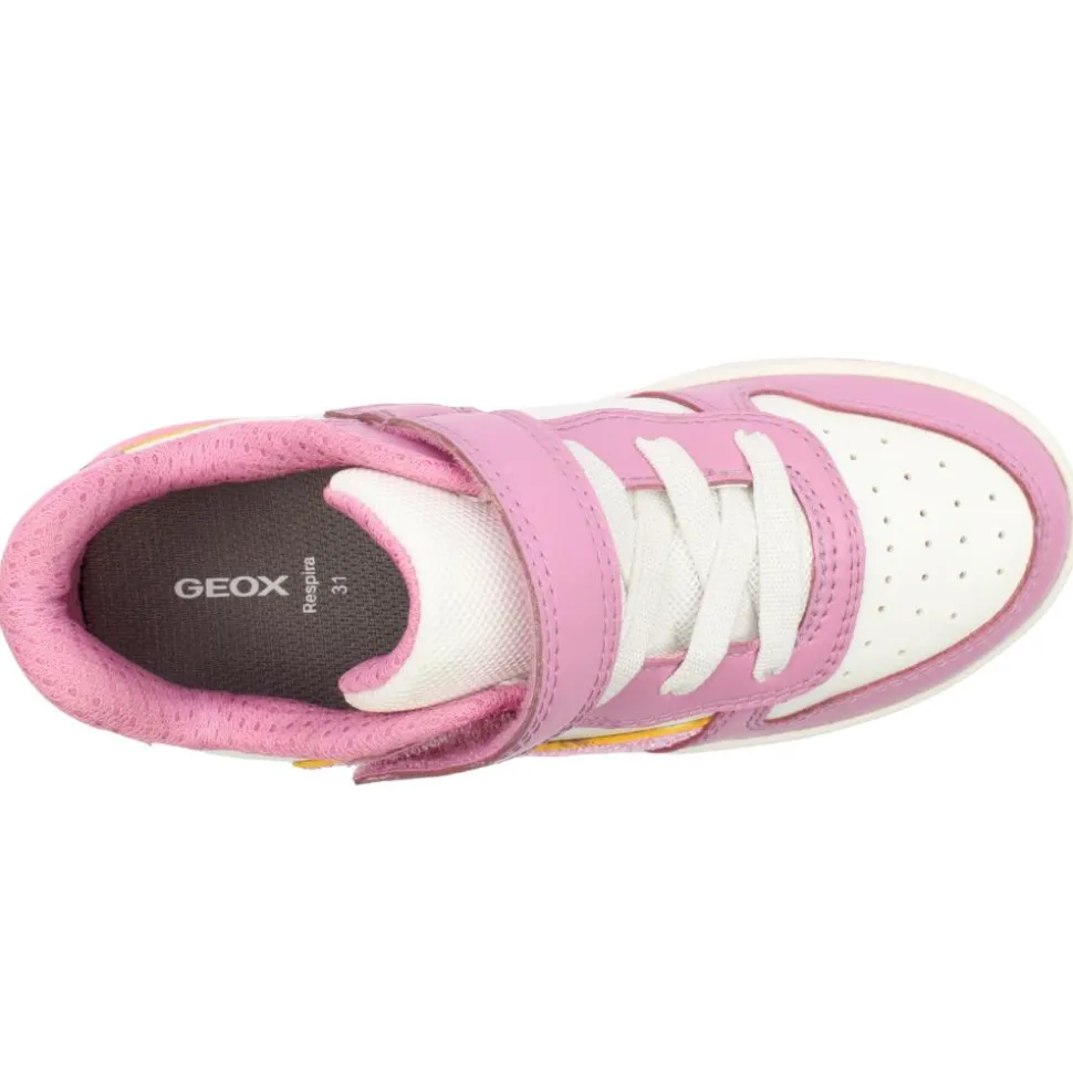 Stylish girls shoes from Geox shoes with a gorgeous pink upper. These girls trainers feature a velcro strap & elastic lace for easy on and off and to keep the shoe secure on the foot. Geox have designed these runners with perforated rubber soles and have inserted a membrane that absorbs and expels sweat without letting water in.