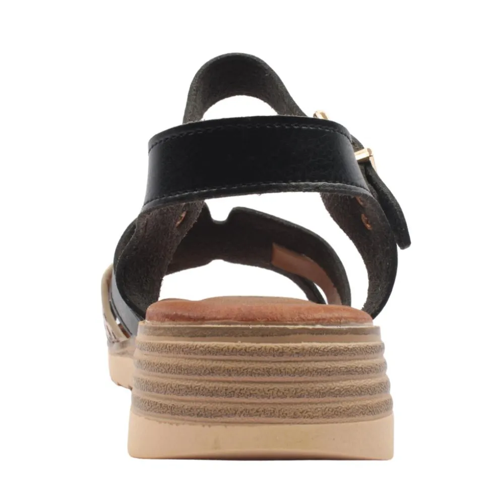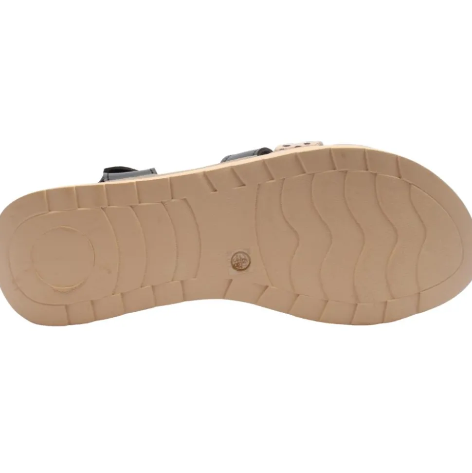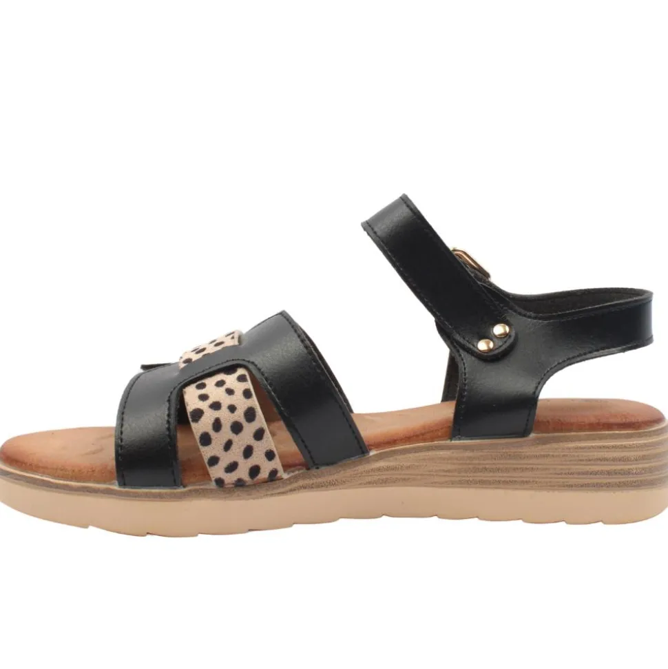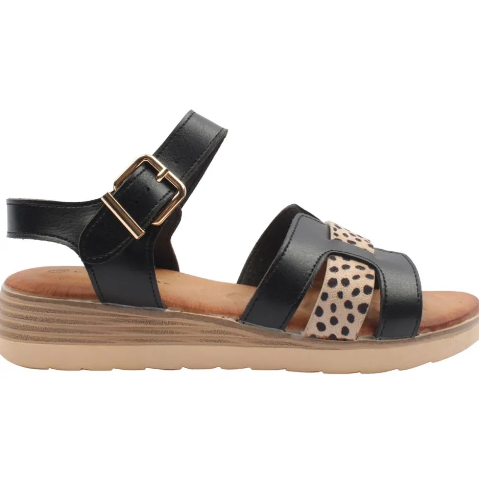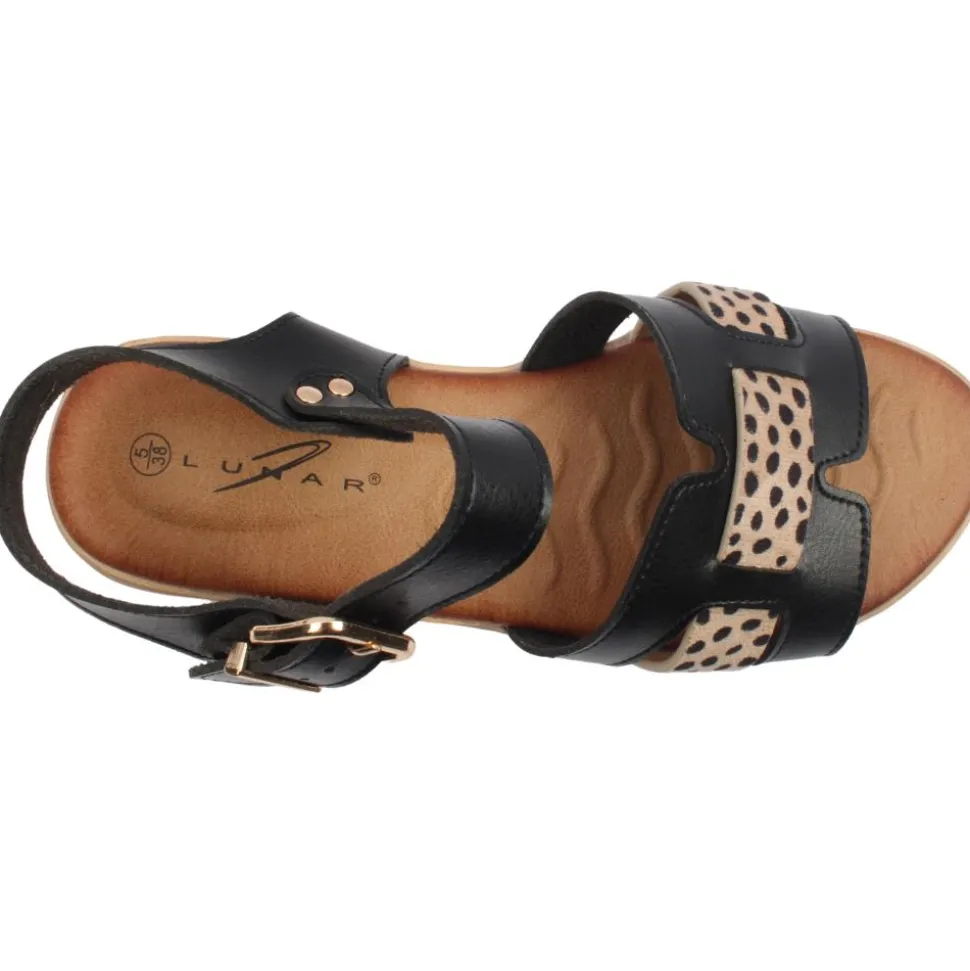 Strappy ladies sandals from Lunar shoes. Featuring a black and animal print upper with an adjustable buckle strap closure for a secure fit.The slight wedge in the heel adds a subtle lift.This sandal is both stylish and practical with a padded cushioned insole for added comfort, it’s the ultimate choice for summer outings.