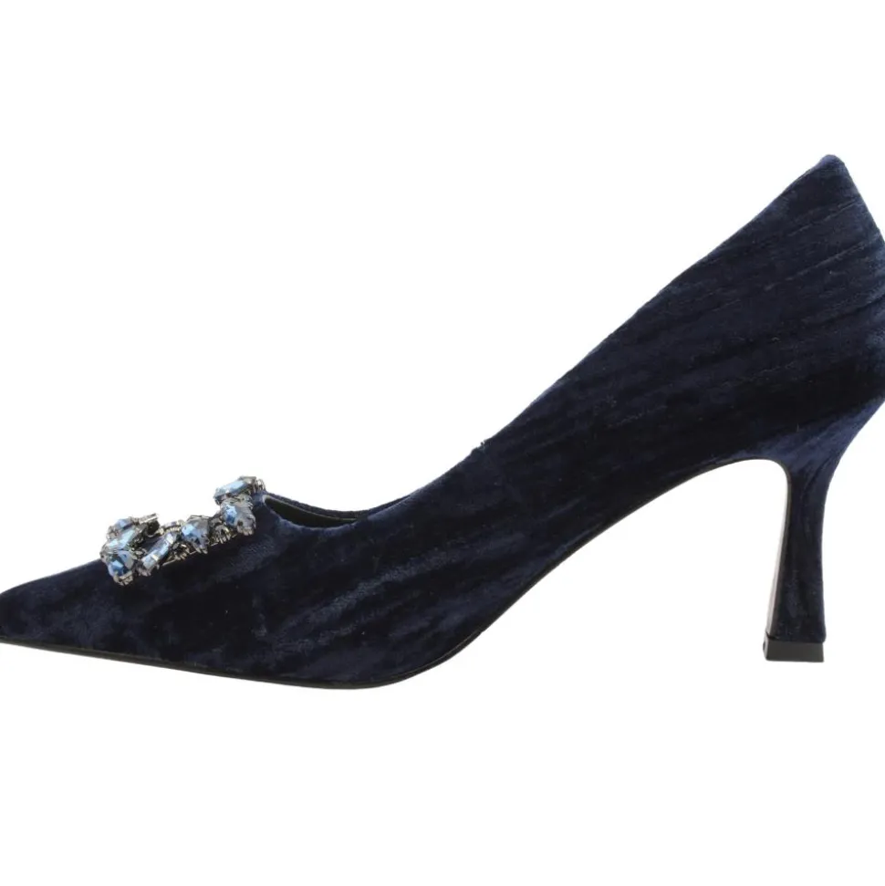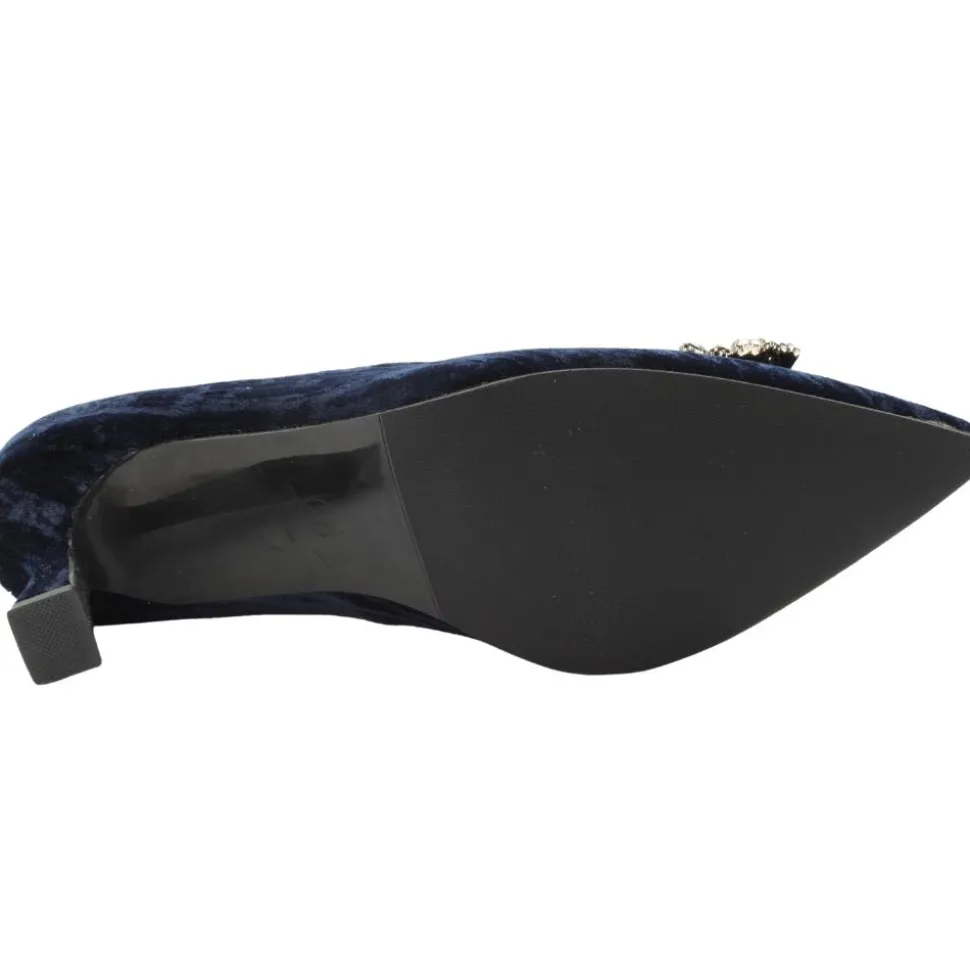 Womens high heel shoes from Kate Appleby shoes. Designed with a beautiful navy velvet crush material, these are the perfect shoe for special occassions. The unique shaped heel and stunning brooch detail add to the appeal of these shoes.