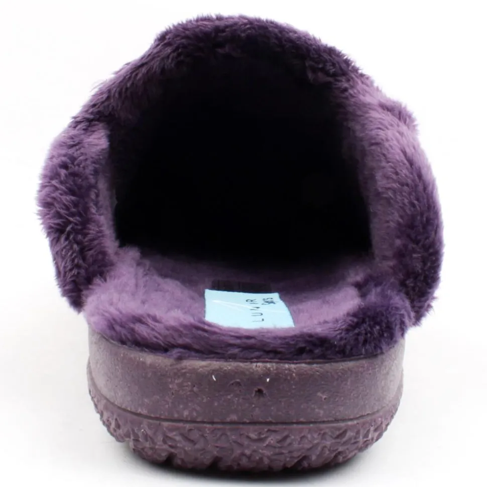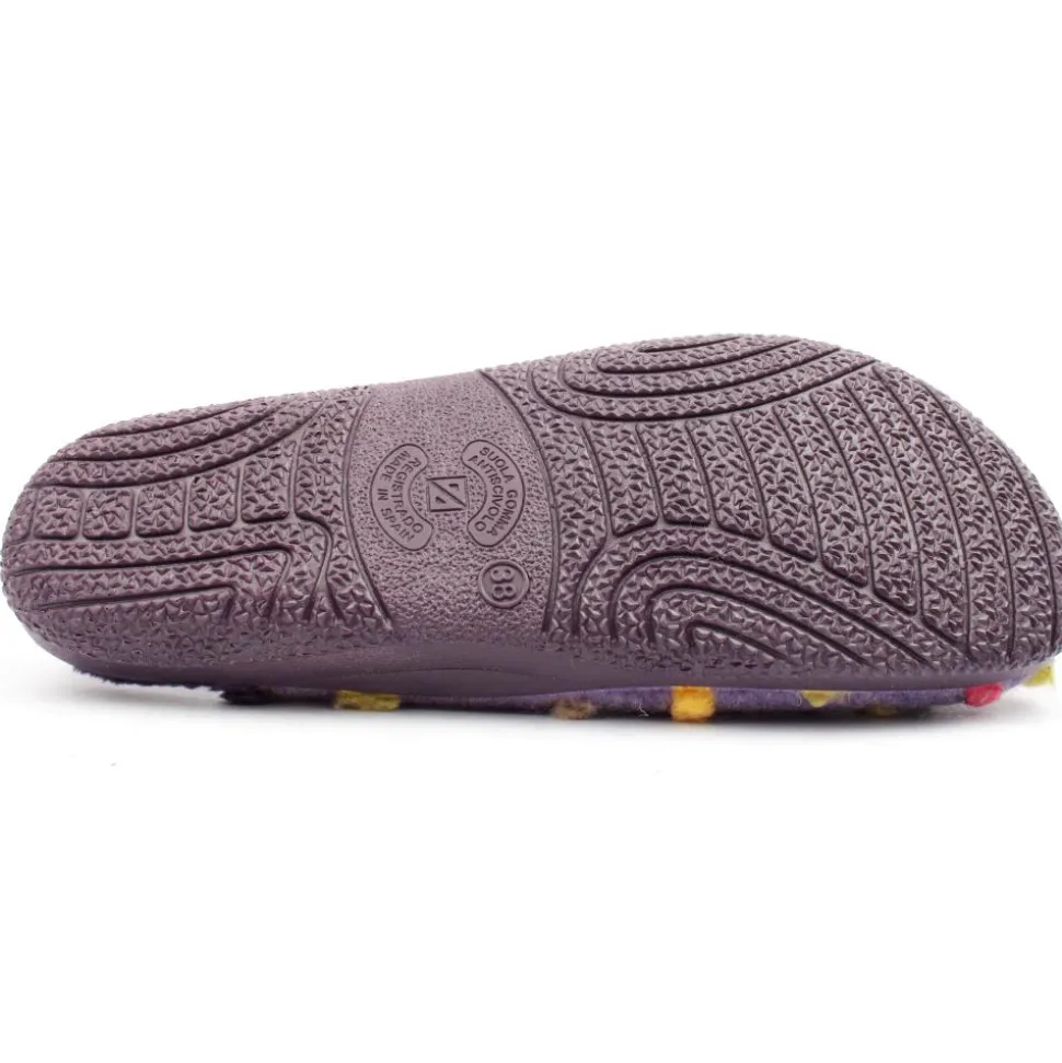 Mule from Lunar Slippers. This ladies slipper style a purple upper with colourful dots along the upper. Cosy fleece lining will keep feet warm on cold nights.