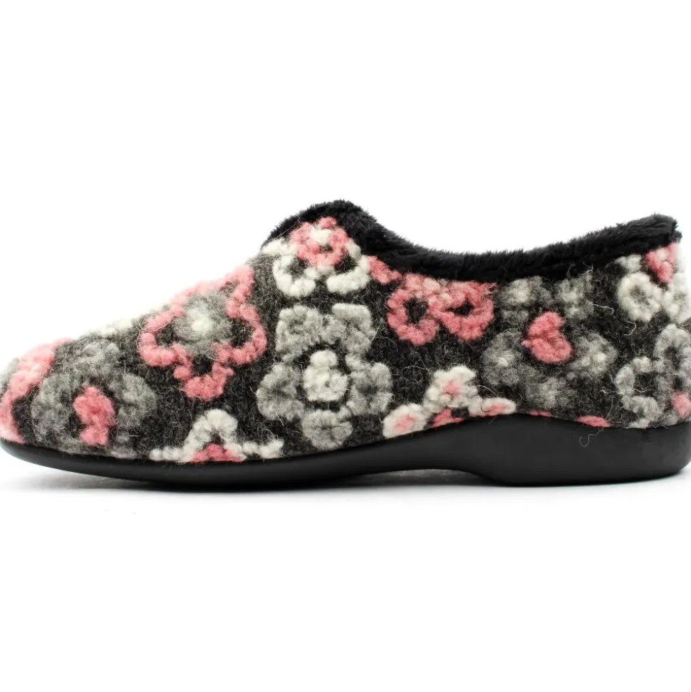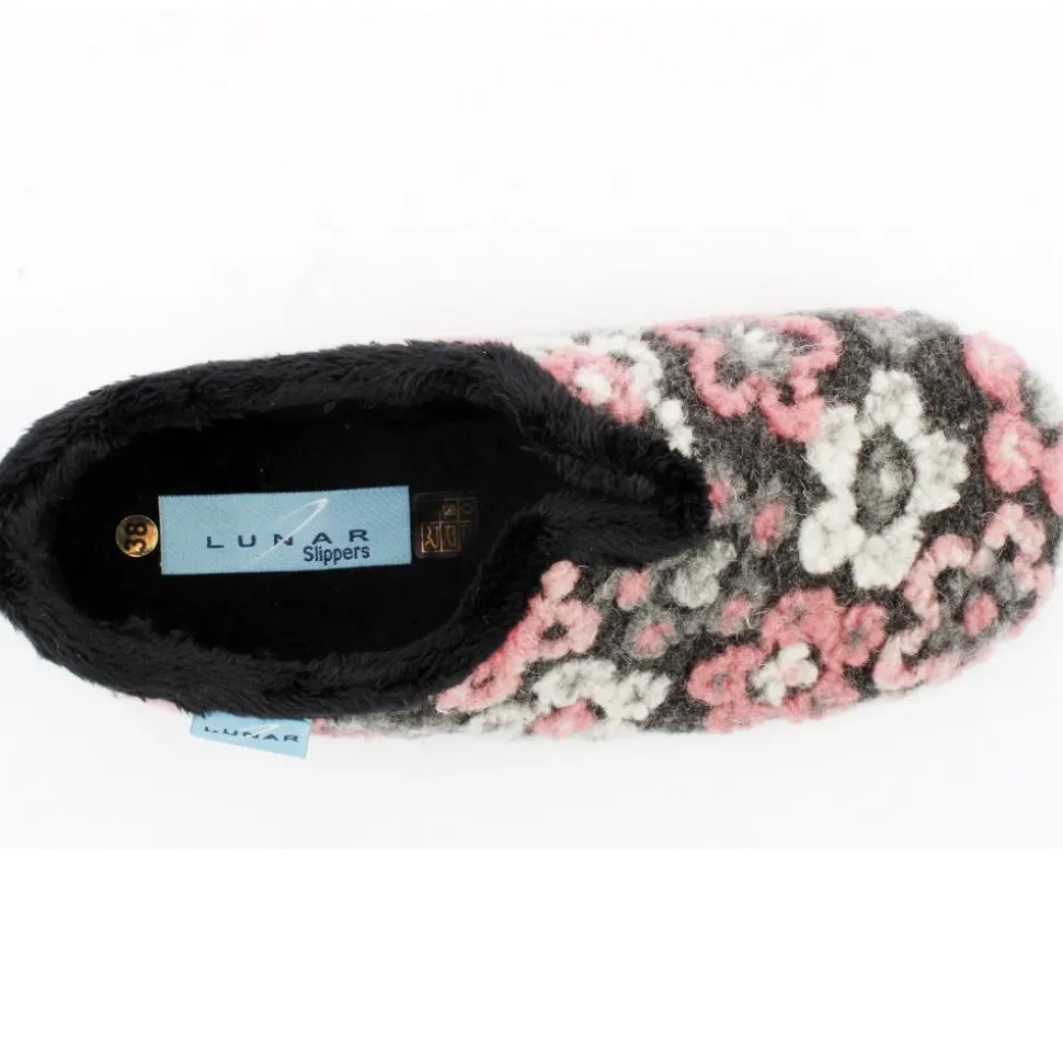 Full slipper from Lunar. This style has a black upper with floral detailing. Cosy lining will keep feet warm on cold nights. These slippers are machine washable at 30 Degrees.