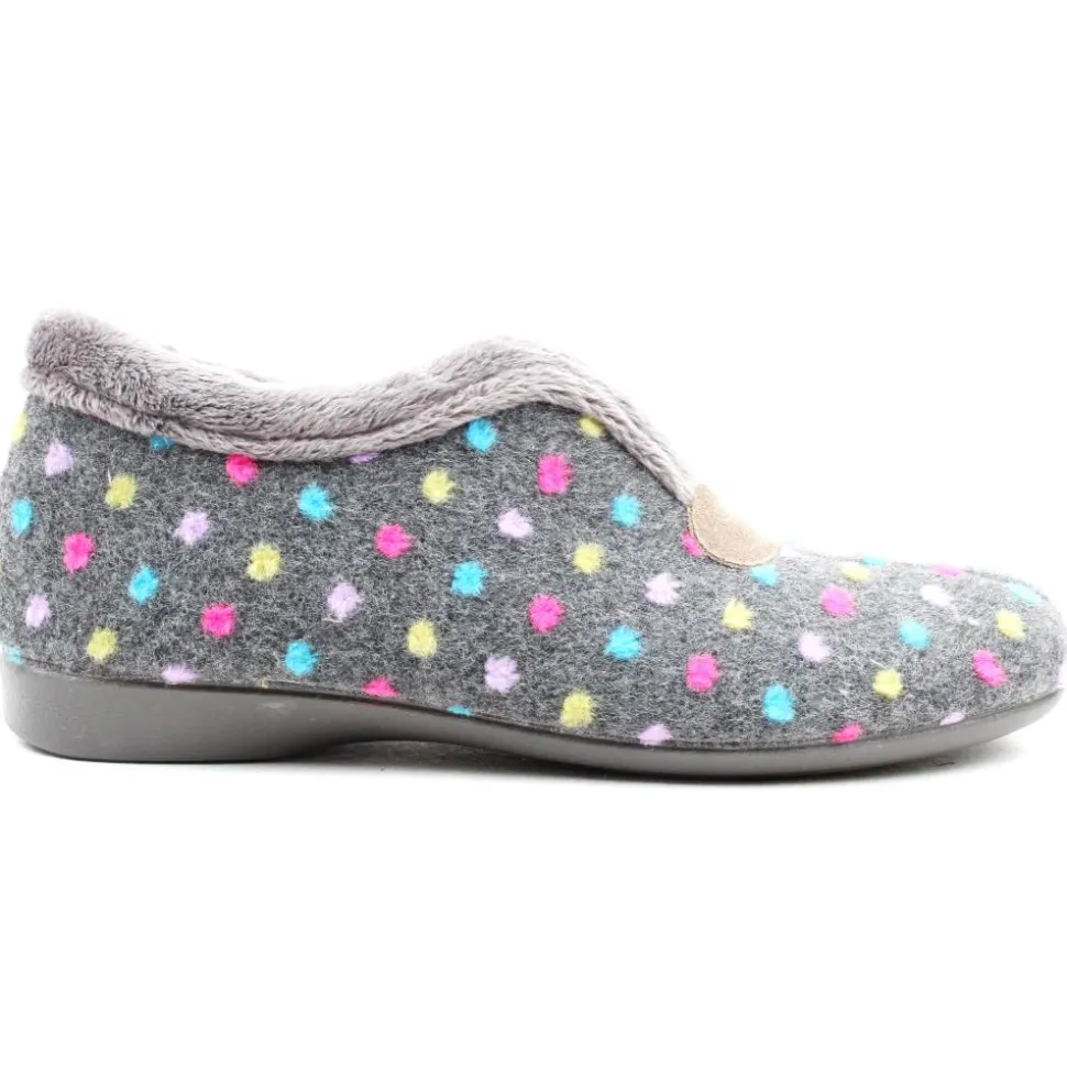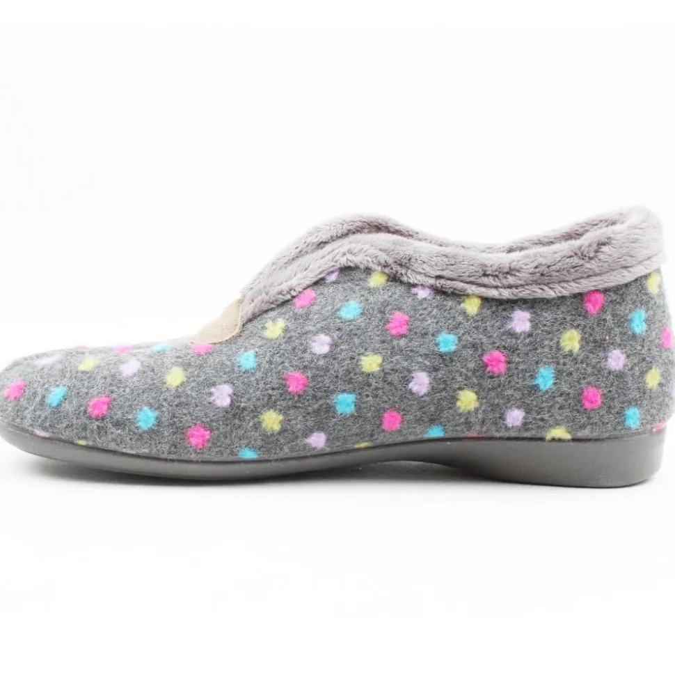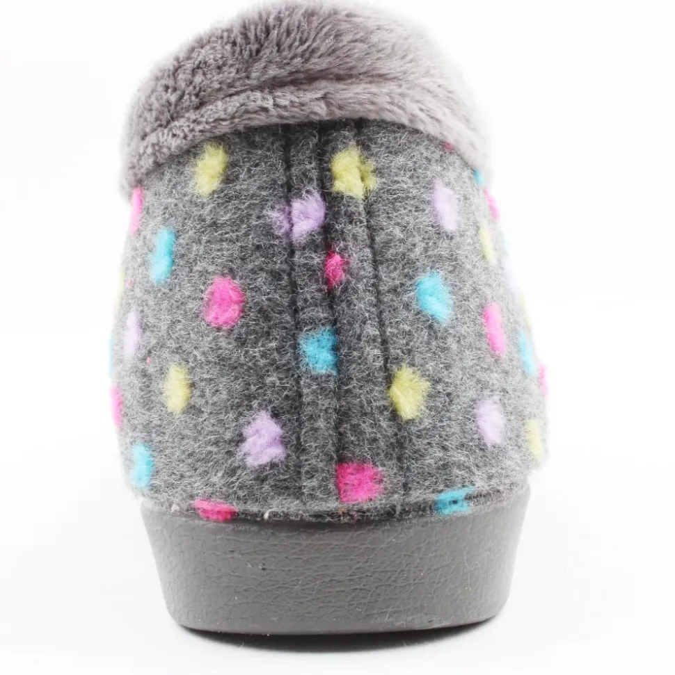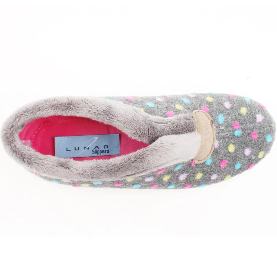 Ladies Slippers from Lunar. Soft grey upper with colourful polka dot detail. Cosy lining & small lift on the heel add to the comfort.