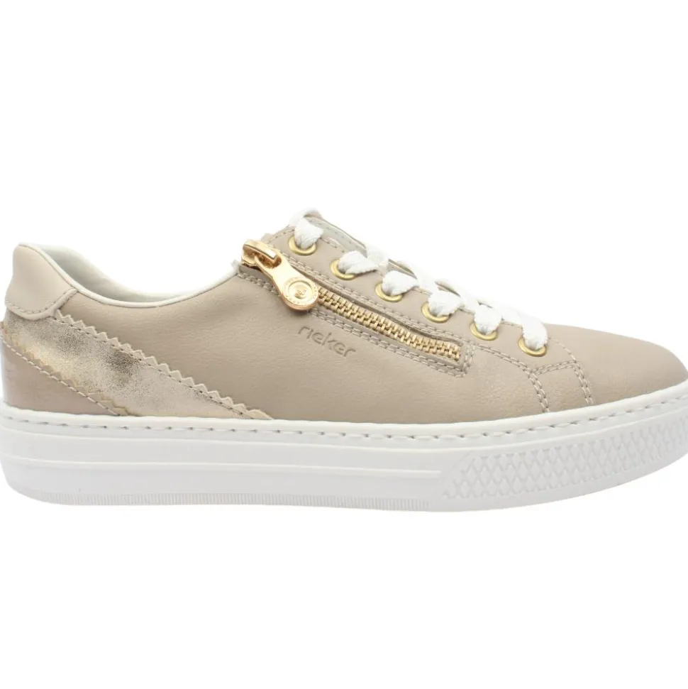 These ladies Rieker shoes,L5900 have a beige upper with shimmering heel design. The combination of zip & lace closure offers easy on/off & allows for a more customised feel. Inside the Rieker Antistress insole provides cushioned support that adapts to your foot, ensuring all-day comfort.