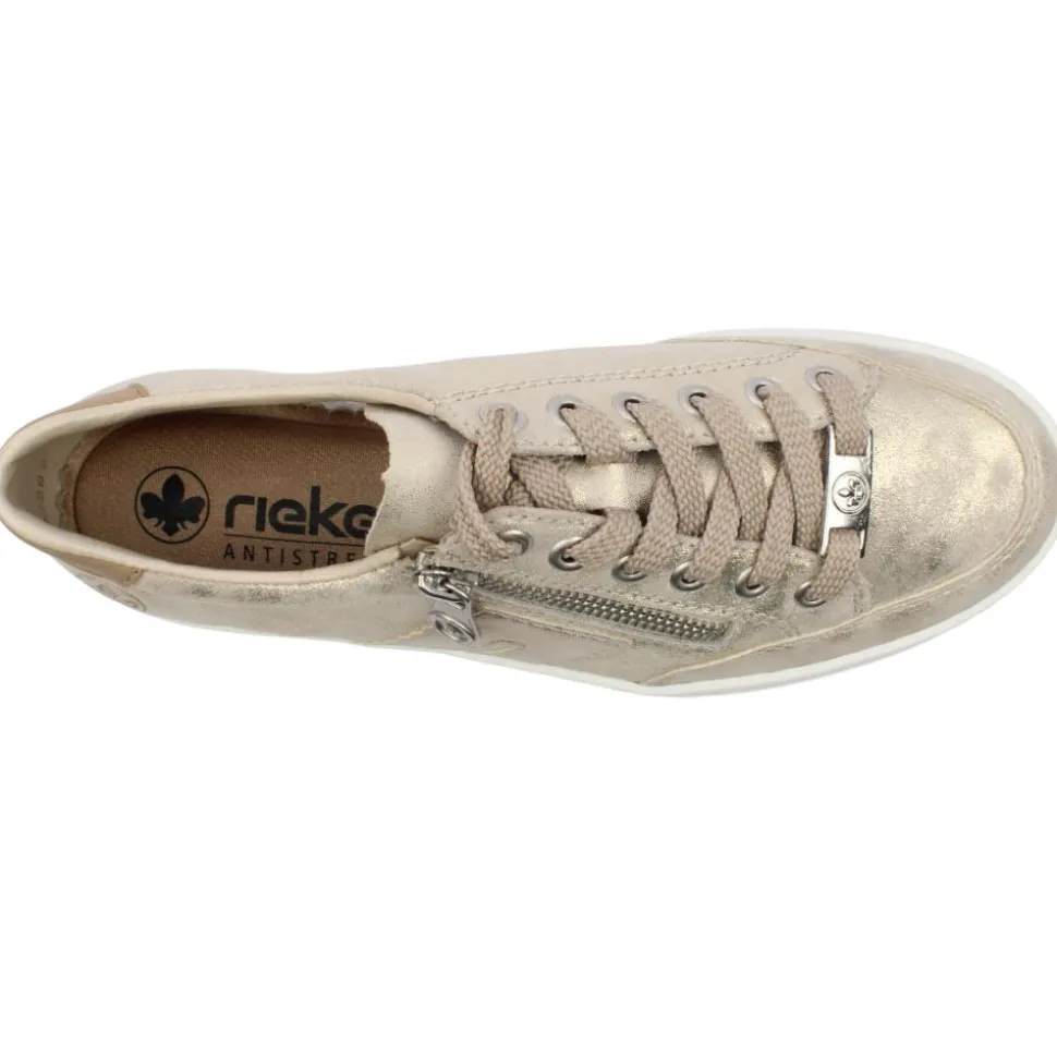 Add a touch of shimmer to your wardrobe with the stylish Rieker L5903, Ladies Runner. Featuring a stunning gold glimmer upper, these shoes effortlessly combine elegance and functionality. The design includes both laces and a side zip, offering a customizable fit and easy on-and-off convenience.