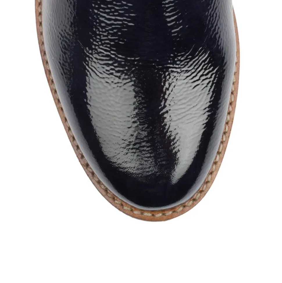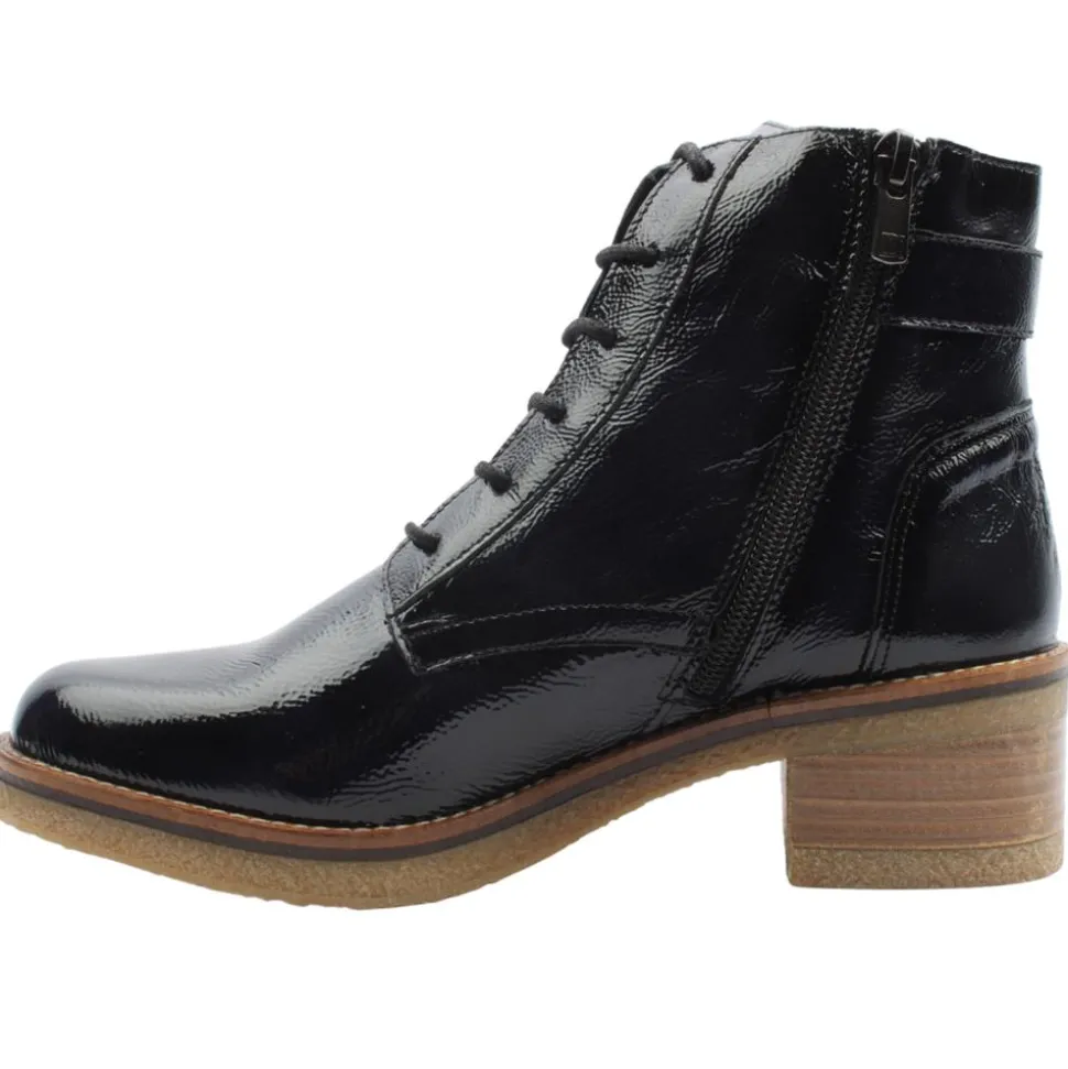 Ladies ankle boots from Dorking By Fluchos. These boots have a patent leather upper. They are ightweight and have a lace & zip closure for easy on/off. The buckle at ankle adds a touch of detail to the boots.