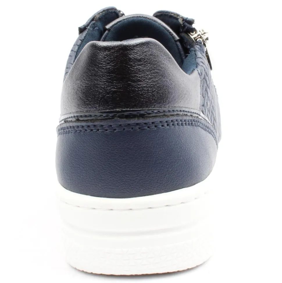 Introducing a casual everyday shoe by Marco Tozzi. This low-profile trainer boasts a navy upper and features both lace and side zip closures, providing effortless on/off wearability. Designed for comfort, this style is equipped with a cushioned removable insole to keep you feeling comfortable all day long.