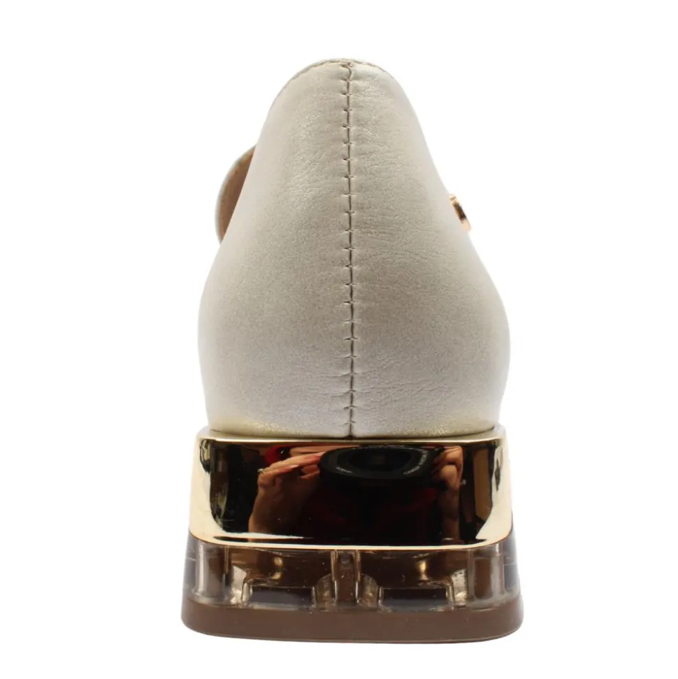 Stylish ladies loafers shoes from Zanni & Co shoes. These ladies loafers have neutral oatmeal upper to match many outifts. They have a gold chain on the front of the shoe for extra detailing. The style has a small block heel & cushioned insole for added comfort.