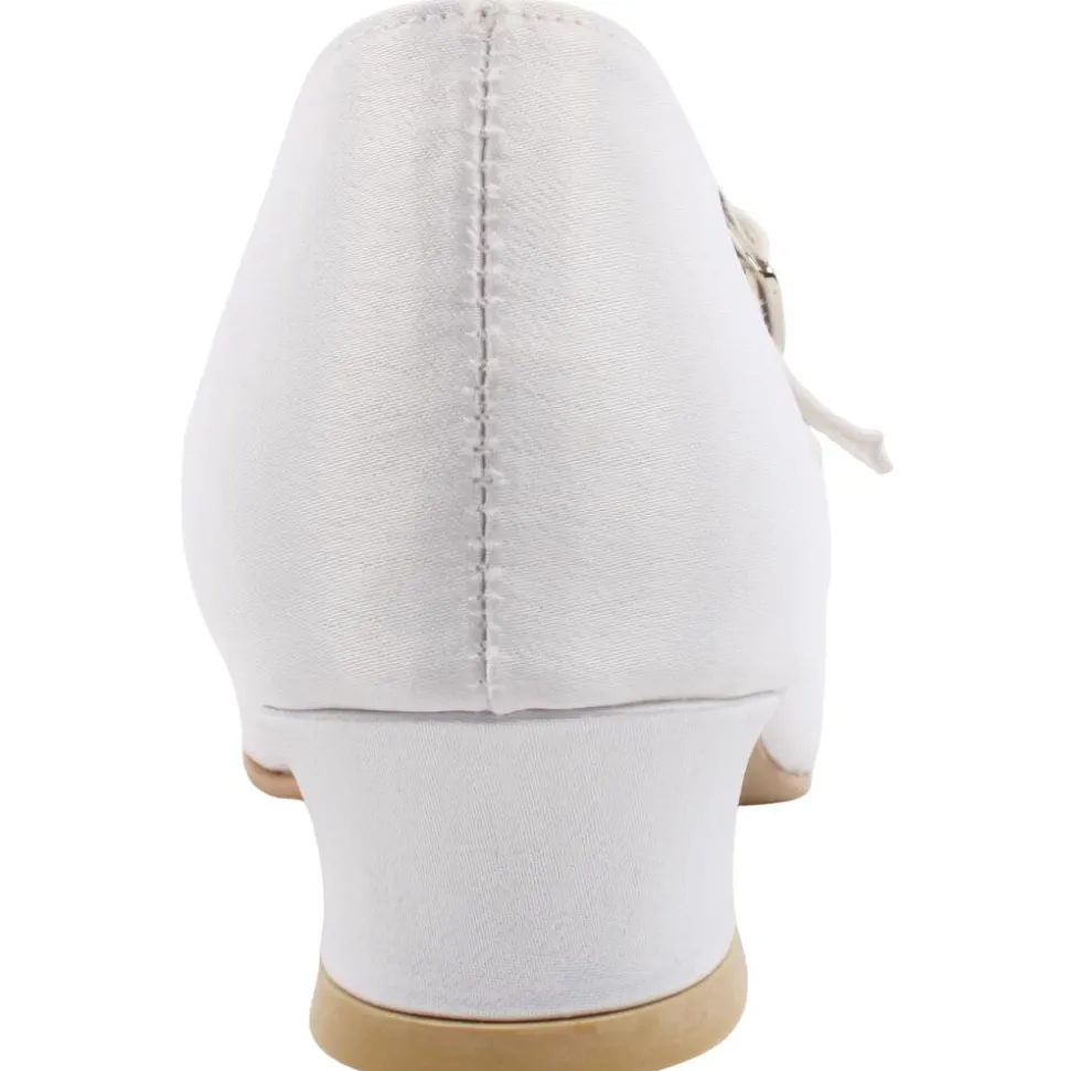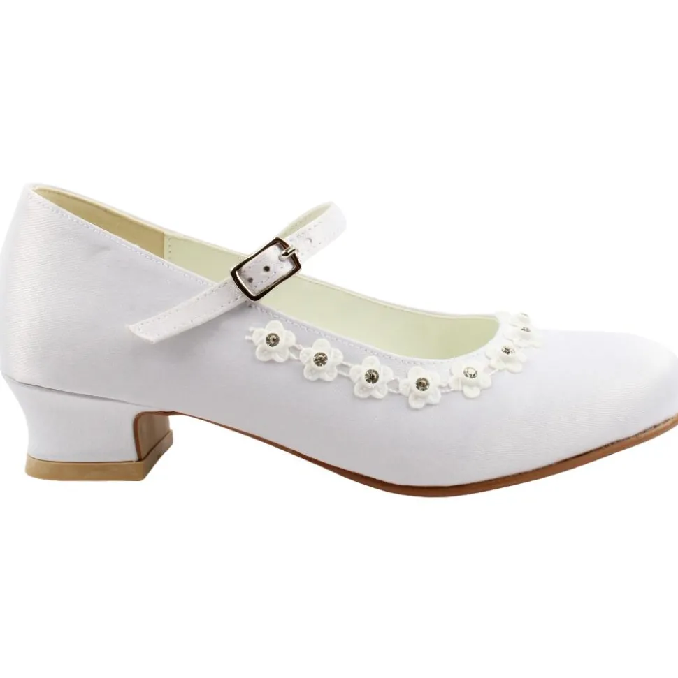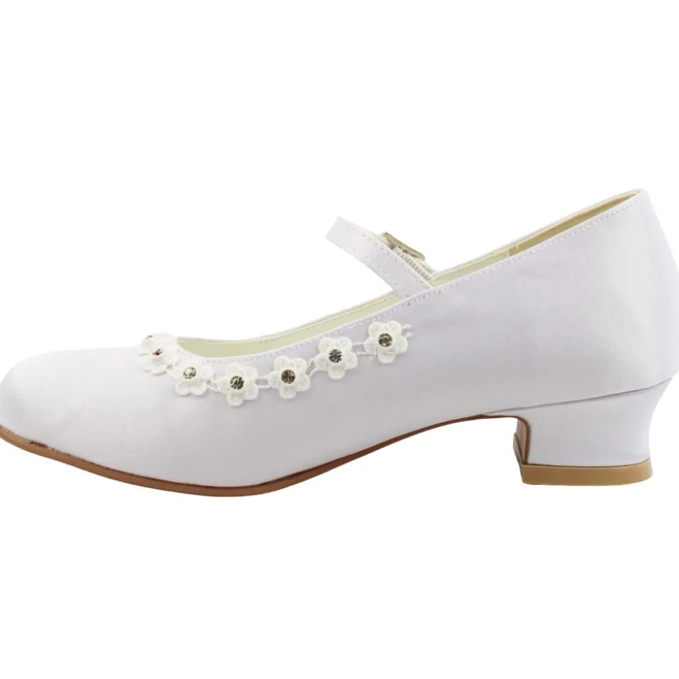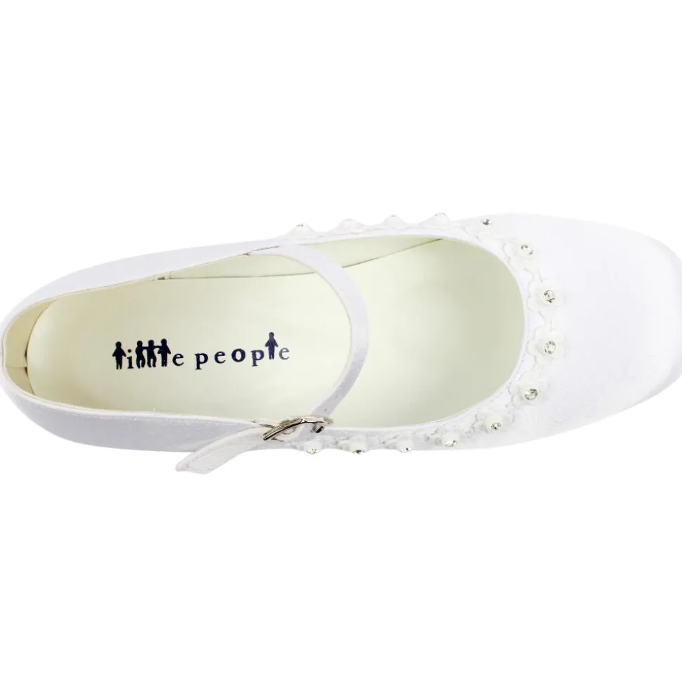 White satin Communion shoes from the Little People collection. These girls communion shoes have a floral trim around the front of the shoe with diamonte details. A strap & buckle closure ensure the foot is kept secure at all times.