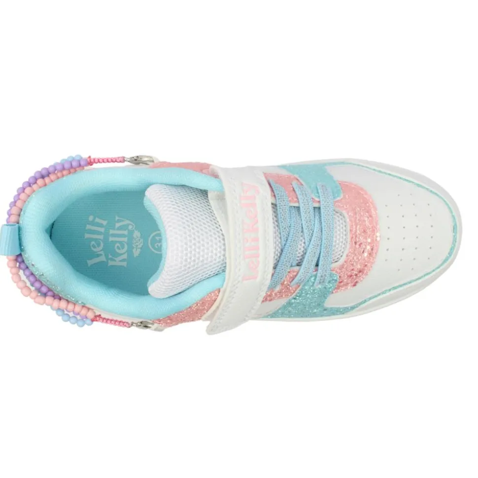 These stylish girls Lelli Kelly shoes feature a white upper adorned with a fun and playful pink/blue glitter design, perfect for little fashionistas. A unique and charming detail is the detachable bracelet around the heel, offering a customisable look that can be worn on or off the shoe. The velcro strap and elastic lace allows for easy on/off.
