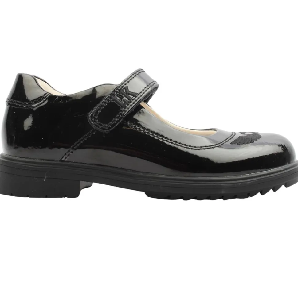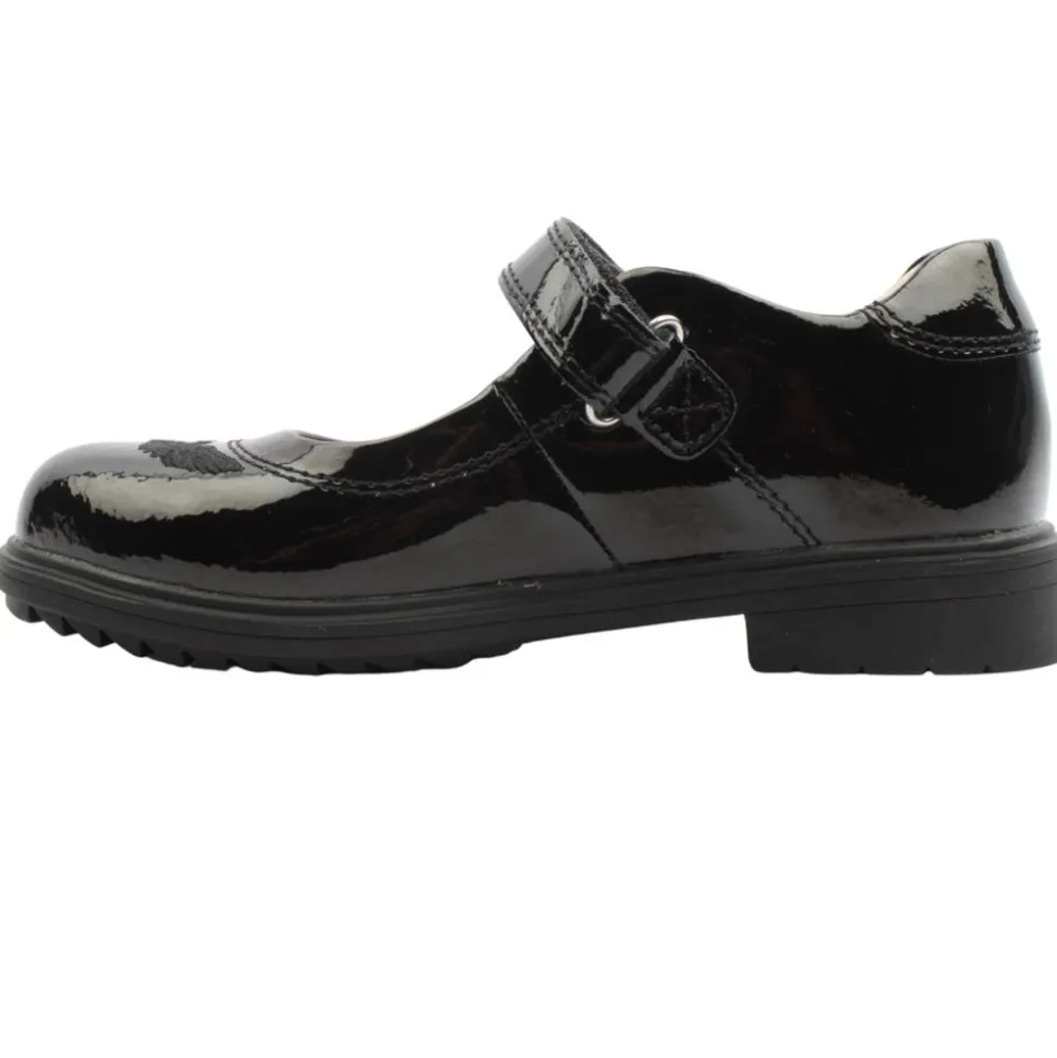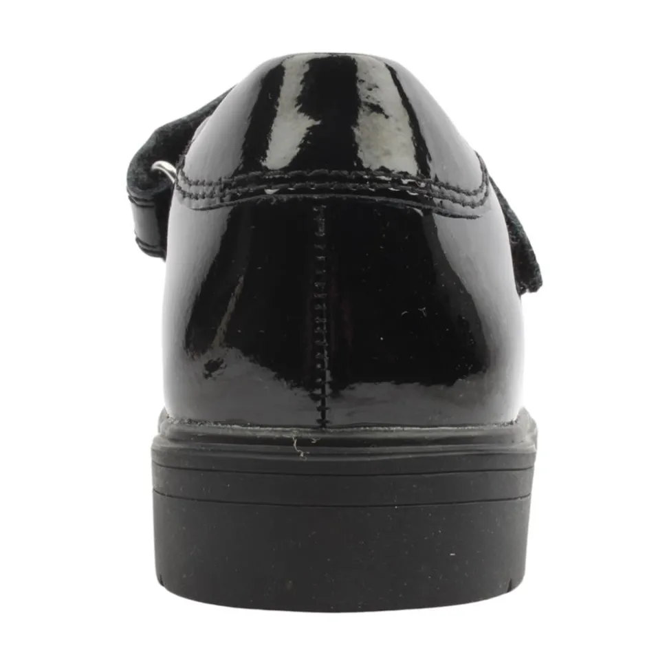 Lelli Kelly school shoes in a black patent upper.T hese shoes are durable and easy to clean thanks to their patent upper. These shoes are designed with comfort in mind, featuring a cushioned insole and a sturdy rubber outsole for all-day wear. The velcro strap closure makes them easy to put on and off.