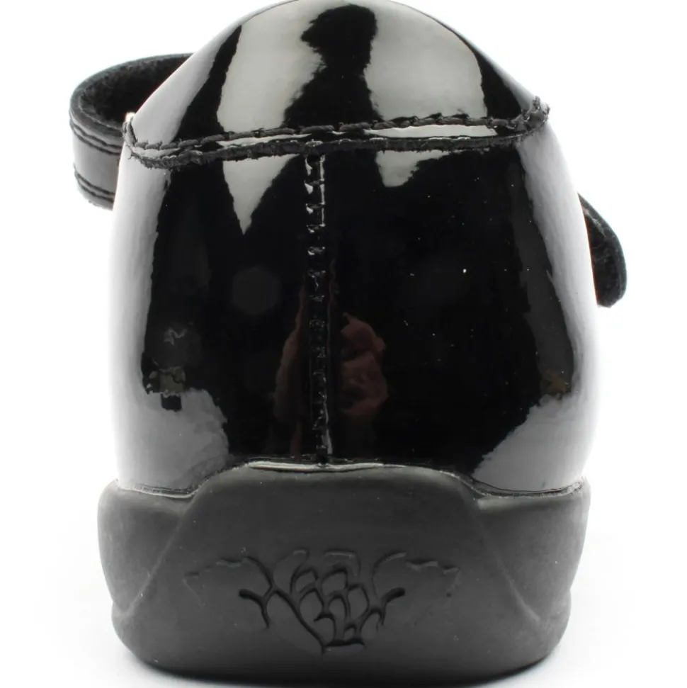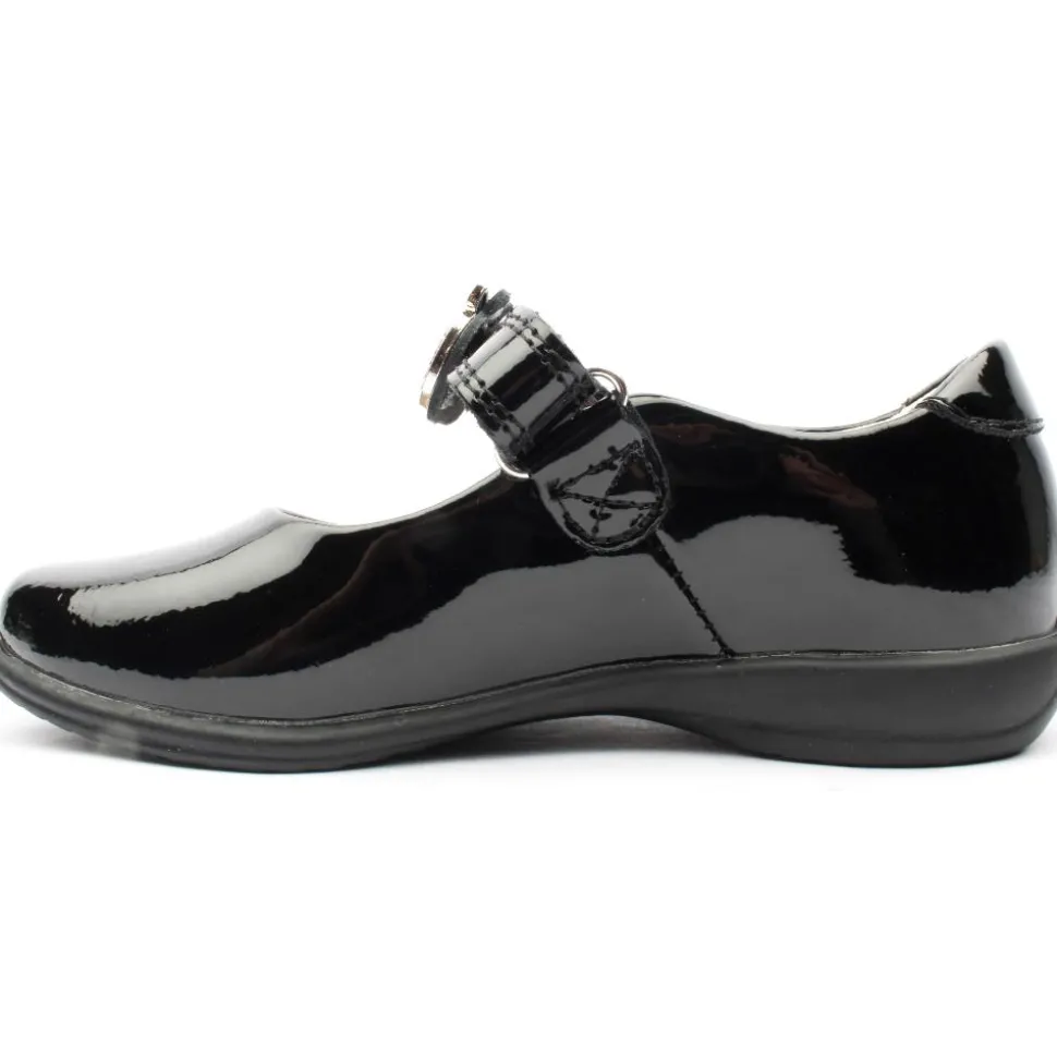 Girls back to school shoes from Lelli Kelly. These girl school shoes have a black patent upper and a diamonte apple brooch. They also have a black bow with elastic loops that can be put onto the straps instead of the apples.