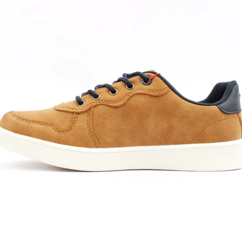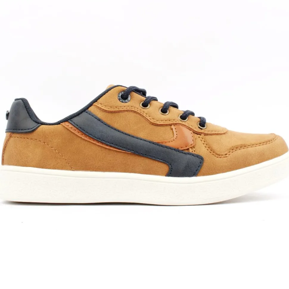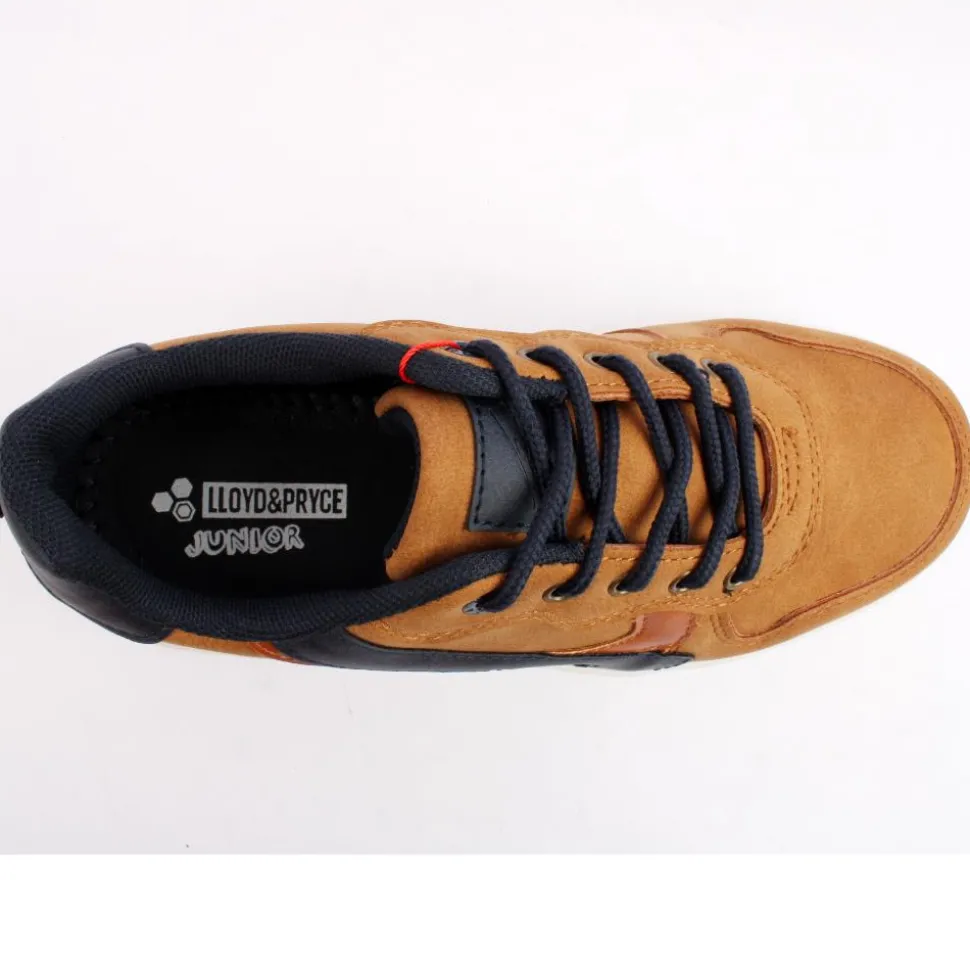 Boys sport inspired shoes from the Lloyd & Pryce Tommy Bowe Kids collection. This shoe has a faux leather camel upper with navy detailing which sits on a white sole. The tongue & collar are padded for extra comfort. Ideal for Boys Communion shoes.