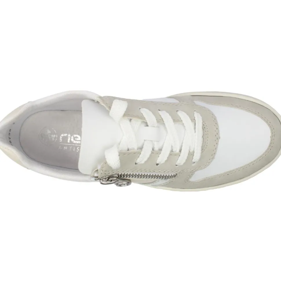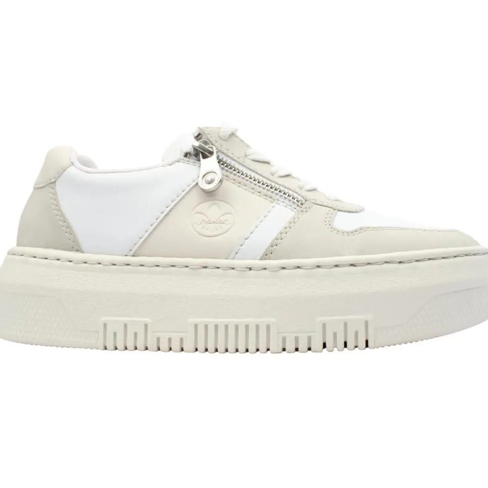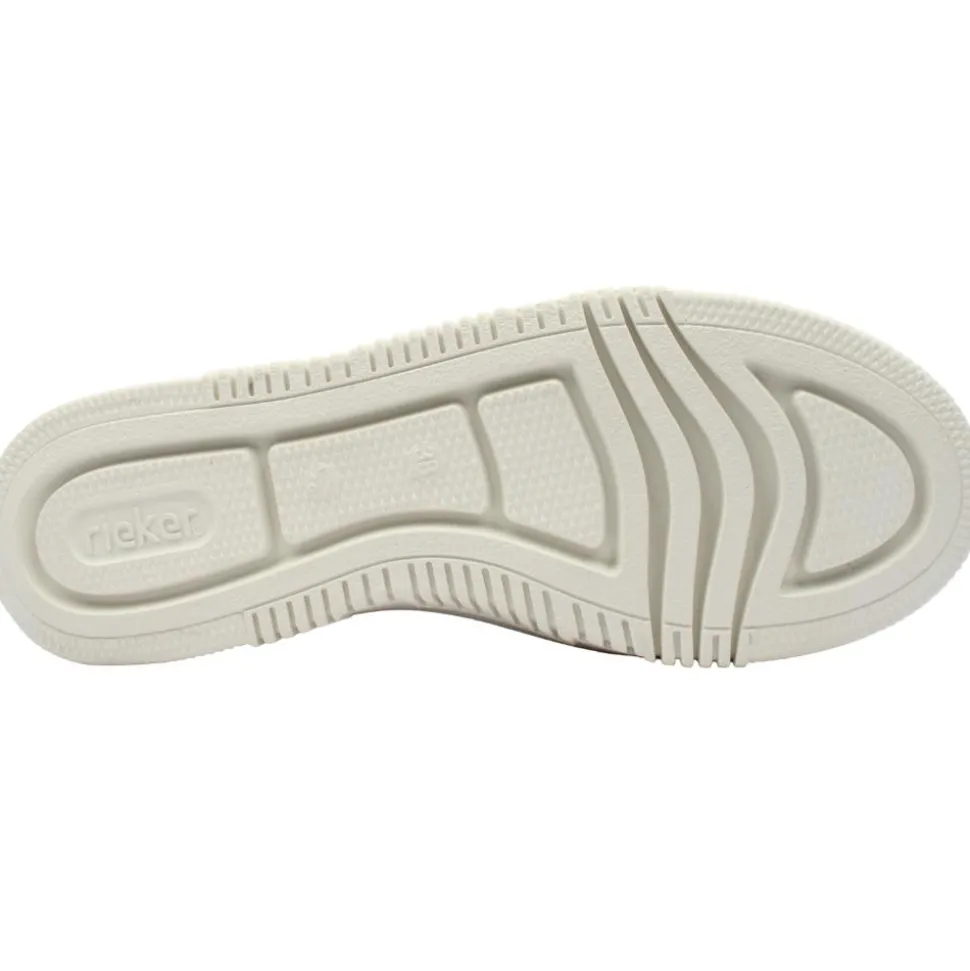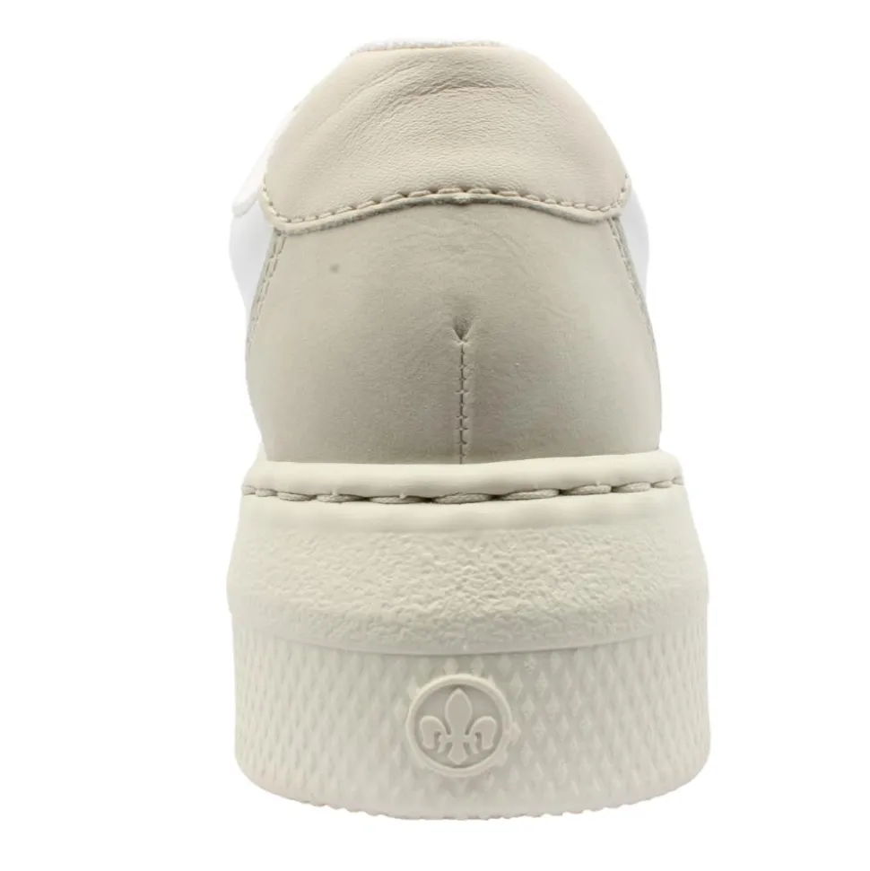 Step into style and comfort with the Rieker Platform Runner M1909 in a chic white beige colorway. Elevate your footwear collection with this fashion-forward yet functional pair designed to seamlessly blend trend-setting aesthetics with reliable performance. This Ladies Trainer boasts a trendy platform sole that adds a touch of contemporary flair to your look. Experience a cloud-like feel with the well-cushioned removeable leather insole that provides exceptional comfort throughout your day