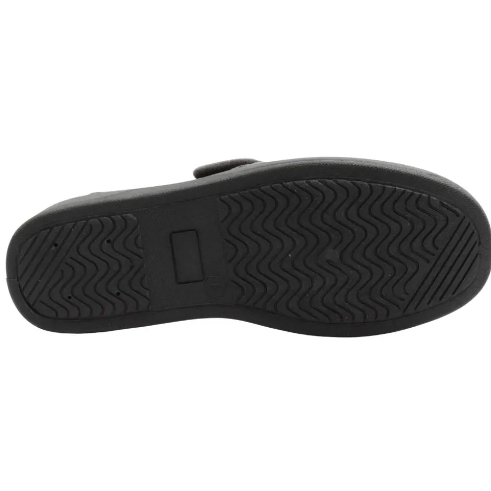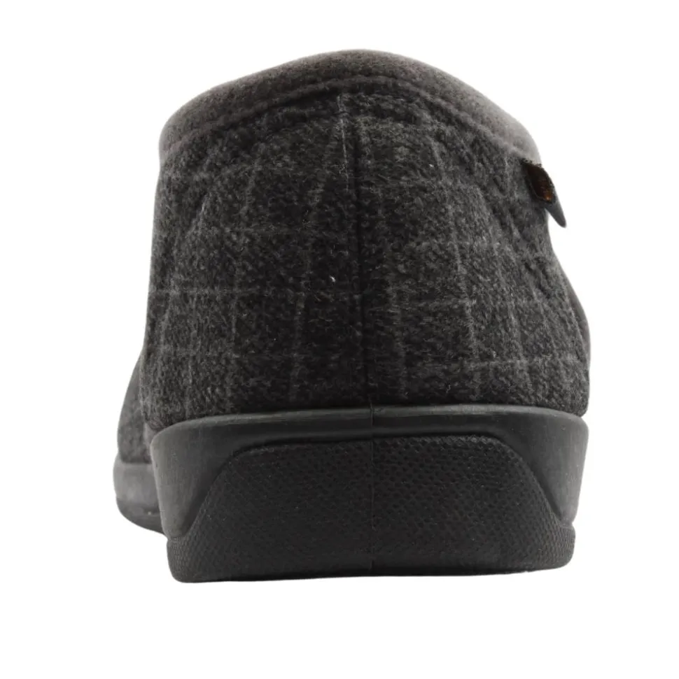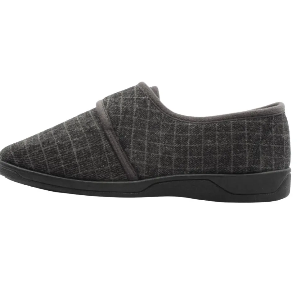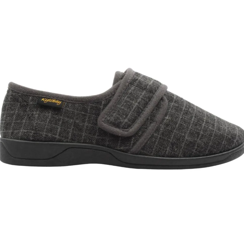 Mens slippers from Kylebay. This slipper has a grey upper.They have a velcro strap closure and fold down tongue for easy on/off.