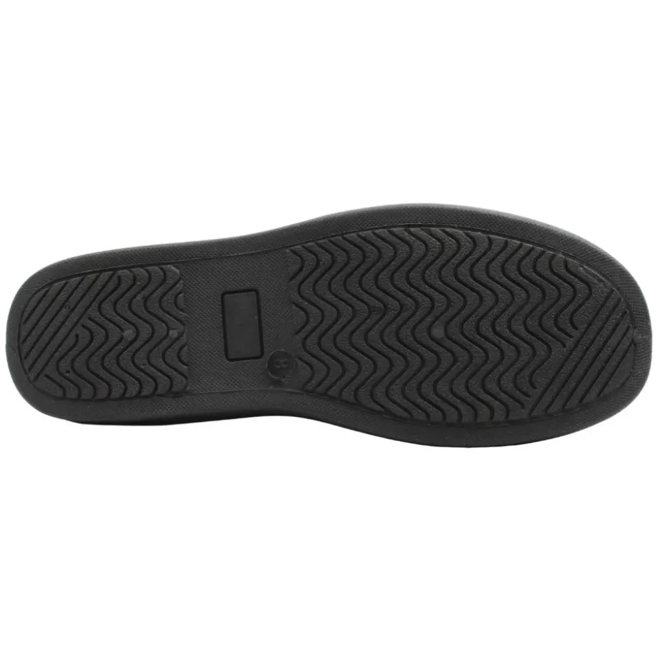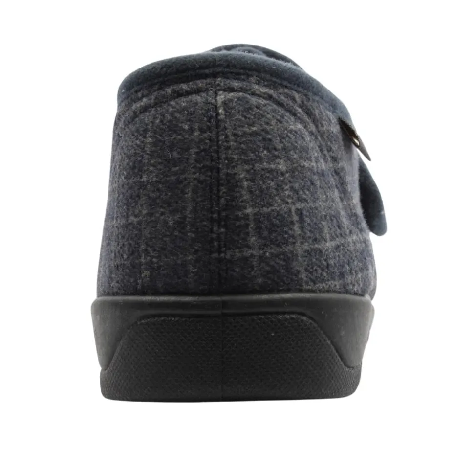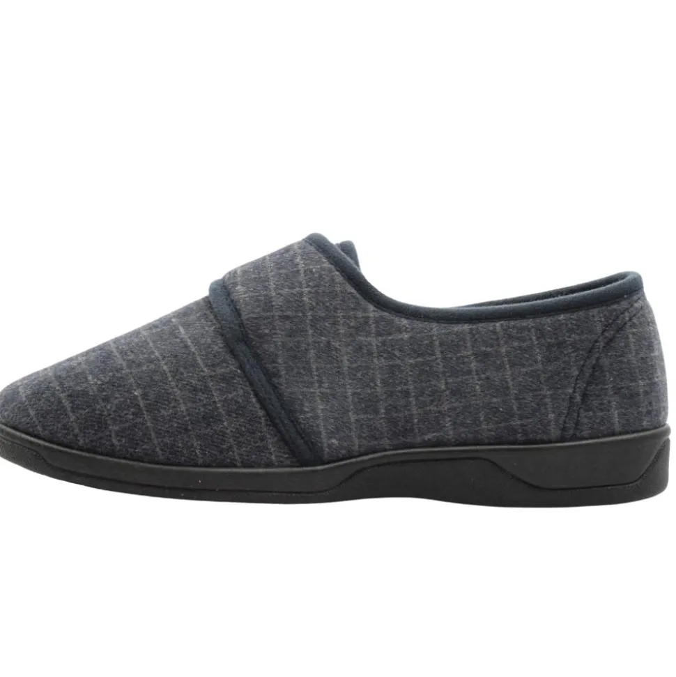 Mens slippers from Kylebay. This slipper has a navy upper.They have a velcro strap closure and fold down tongue for easy on/off.