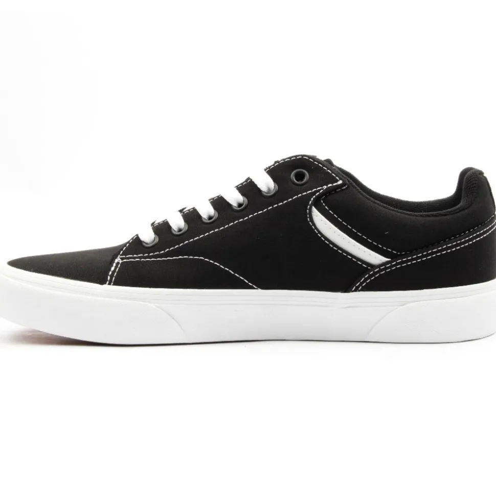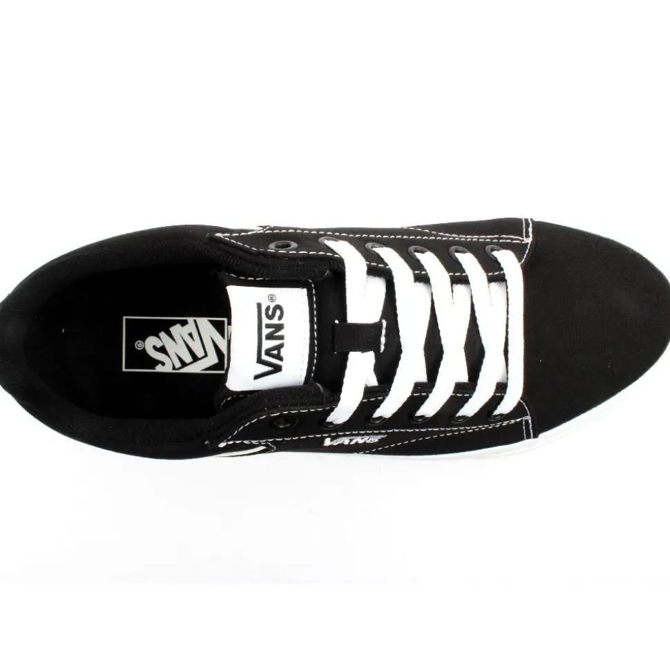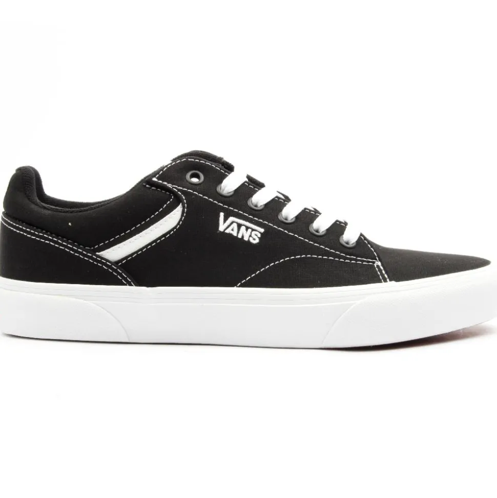 Seldan, from Vans Shoes has a black /white upper embossed with Vans detailing, sat upon a Vans original waffle sole. Vans branding can be seen at the side, tongue and heel of the shoe. A p added tongue and collar add to the comfort of this shoe.