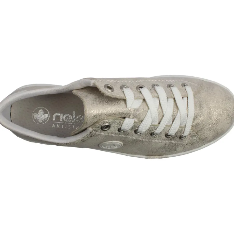 These ladies Rieker shoes N49W1 have a lovely gold textured upper with contrasting white sole unit.Fe aturing a lace closure which offers a snug fit and allows for a more customised feel. Inside the Rieker Antistress insole provides cushioned support that adapts to your foot, ensuring all-day comfort.