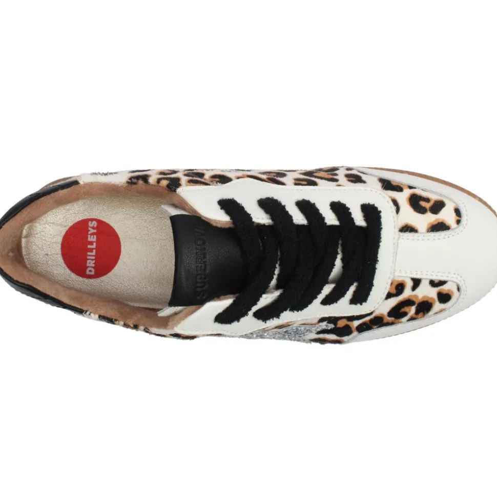 Make a statement with the Drilleys Ladies Runner, featuring a bold leopard print design with eye-catching silver star detailing. This fashion-forward sneaker blends style and comfort, making it the perfect choice for trendsetters on the go.