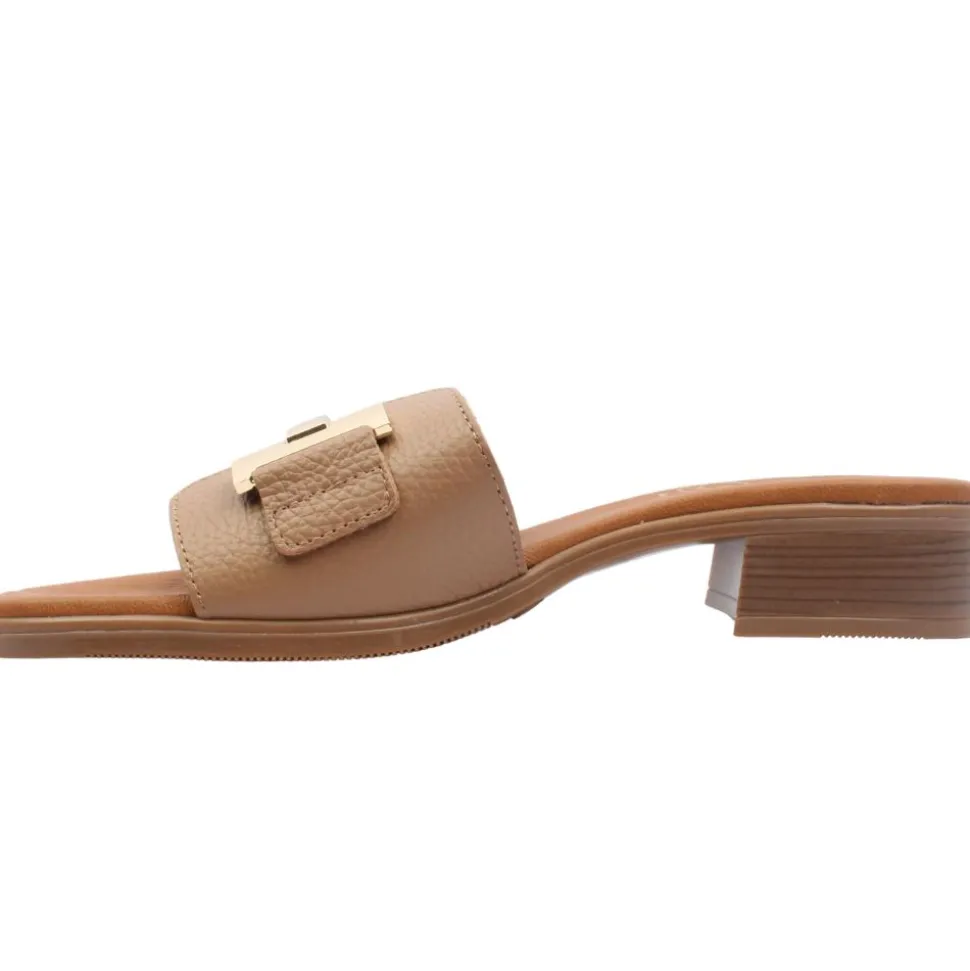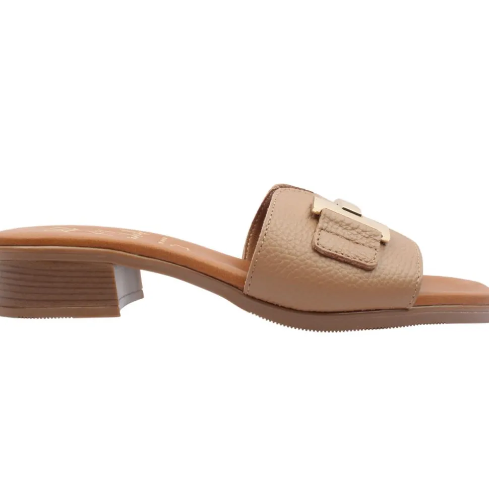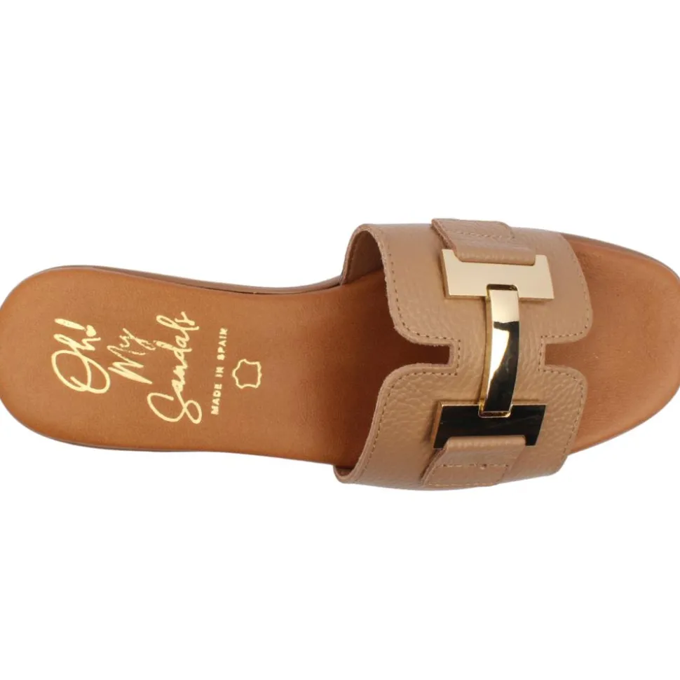 Dressy mule from Oh My Sandals. This gorgeous mule has a soft beige leather upper with an oversized gold brooch at the toe. This style has a cushioned leather insole and slight lift in sole the for added comfort.
