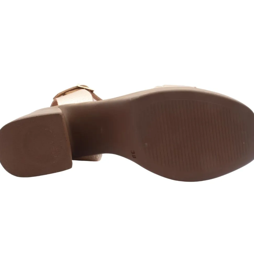 Dressy heeled sandal from Oh My Sandals. This gorgeous heeled sandal has a soft gold leather upper with an oversized gold brooch across the foot. This style has a cushioned leather insole for added comfort.
