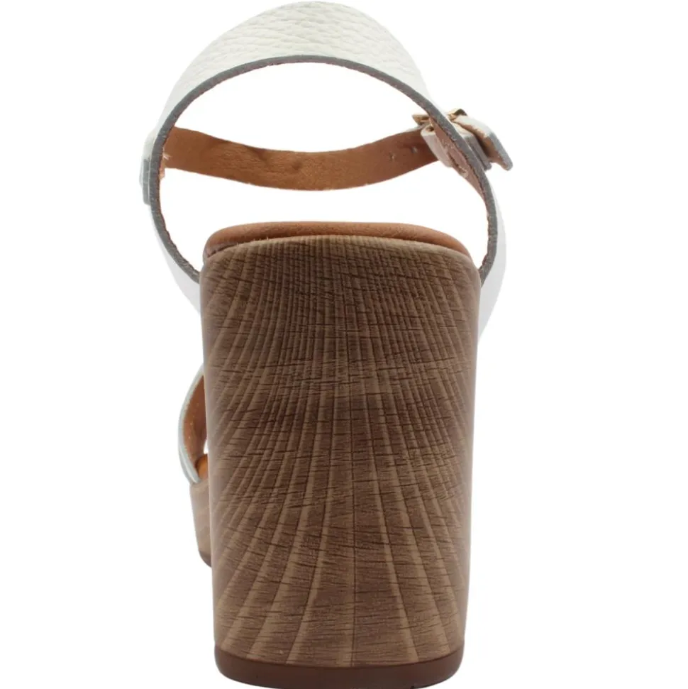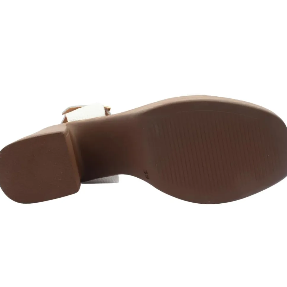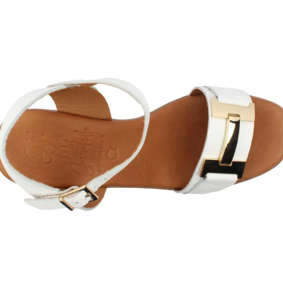 Dressy heeled sandal from Oh My Sandals. This gorgeous heeled sandal has a soft white leather upper with an oversized gold brooch at the toe. This style has a cushioned leather insole for added comfort.