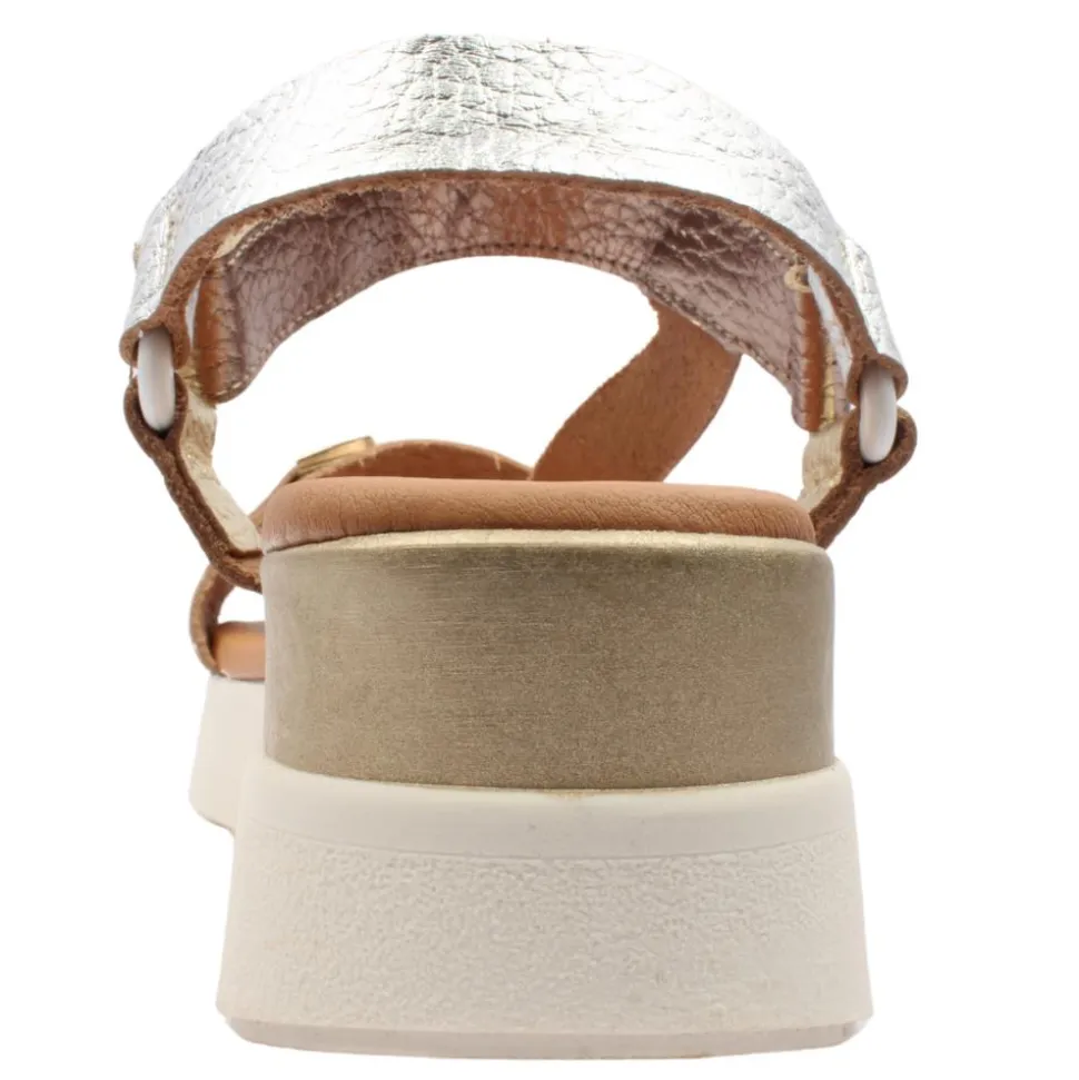 Stylish ladies sandals from Oh my Sandals. They have a soft metallic upper with a gold buckle detail across the toe. A Velcro strap closure allows for easy on/off while keeping the foot secure. It has a cushioned leather insole and platform sole.