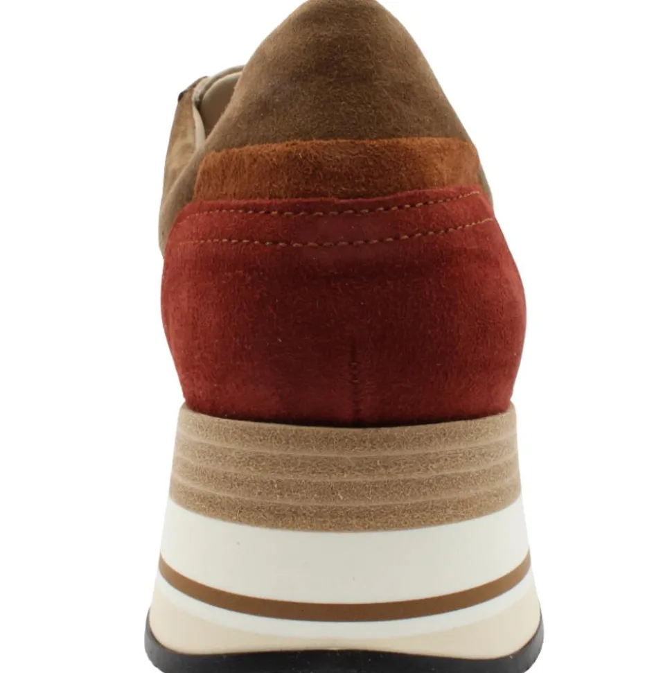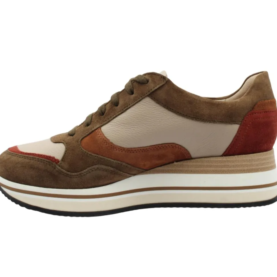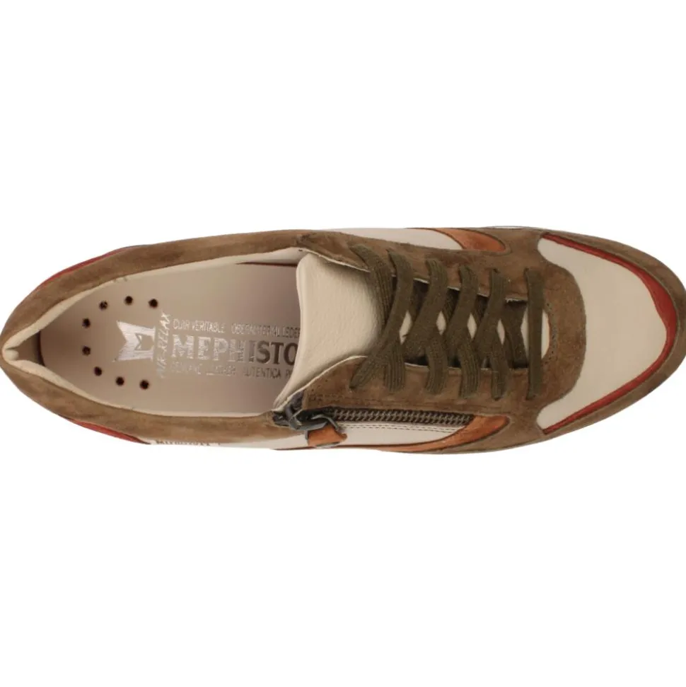 Ladies wedge trainers fom Mephisto shoes. These Mephisto shoes have a gorgeous brown/beige & khaki green upper with a lace and side zip closure which allows for easy on/off. Mephisto Soft-Air technology ensures walking comfort when wearing. The soft-air midsole reduces the shock from walking to a minimum. This protects your feet, joints & vertebrae, while maintaining a healthy environment for your feet. The removable footbed promotes the smooth movement of the foot & reduces the shock resulting from walking. This insole can be replaced with your own personal custom orthotics.